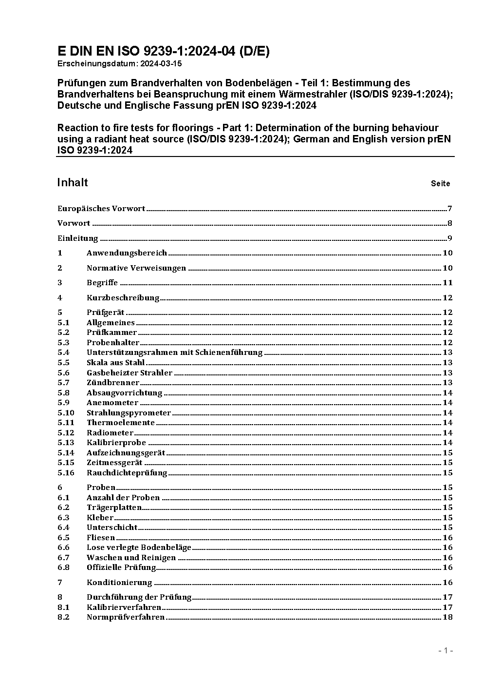 Prüfungen zum Brandverhalten von Bodenbelägen - Teil 1: Bestimmung des Brandverhaltens bei Beanspruchung mit einem Wärmestrahler (ISO 9239-1:2010); Deutsche Fassung EN ISO 9239-1:2010