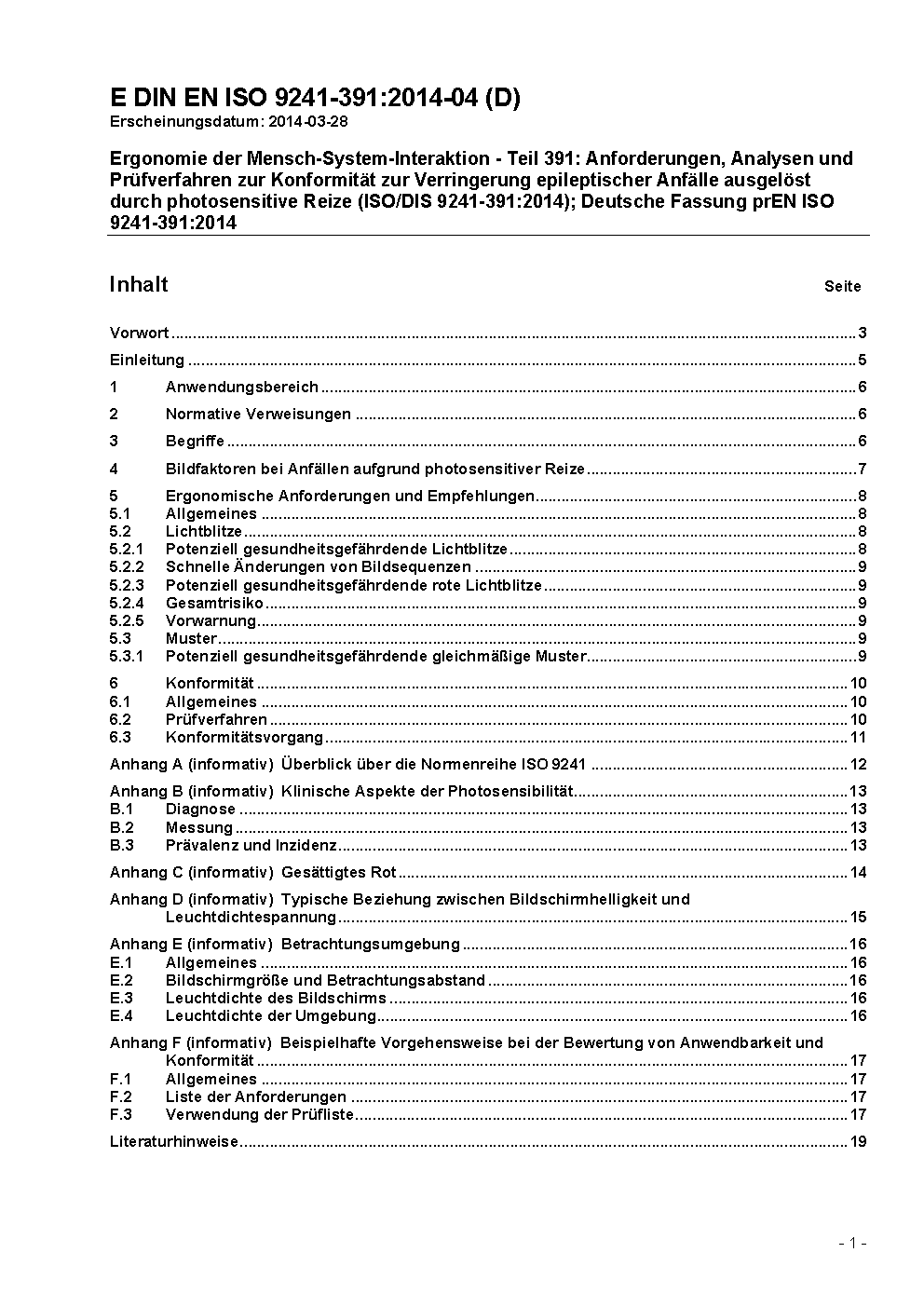 Ergonomie der Mensch-System-Interaktion - Teil 391: Anforderungen, Analysen und Prüfverfahren zur Konformität zur Verringerung epileptischer Anfälle ausgelöst durch photosensitive Reize (ISO/DIS 9241-391:2014); Deutsche Fassung prEN ISO 9241-391:2014