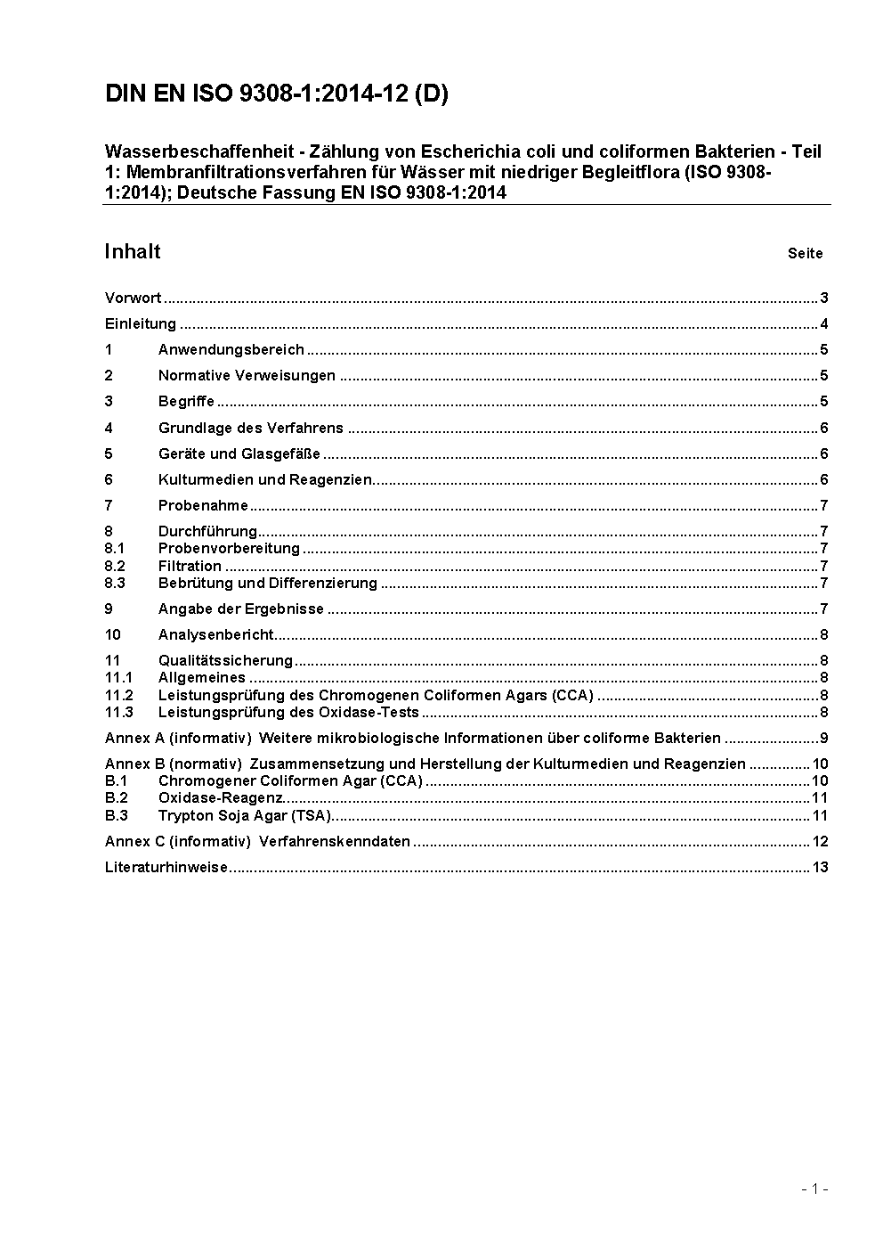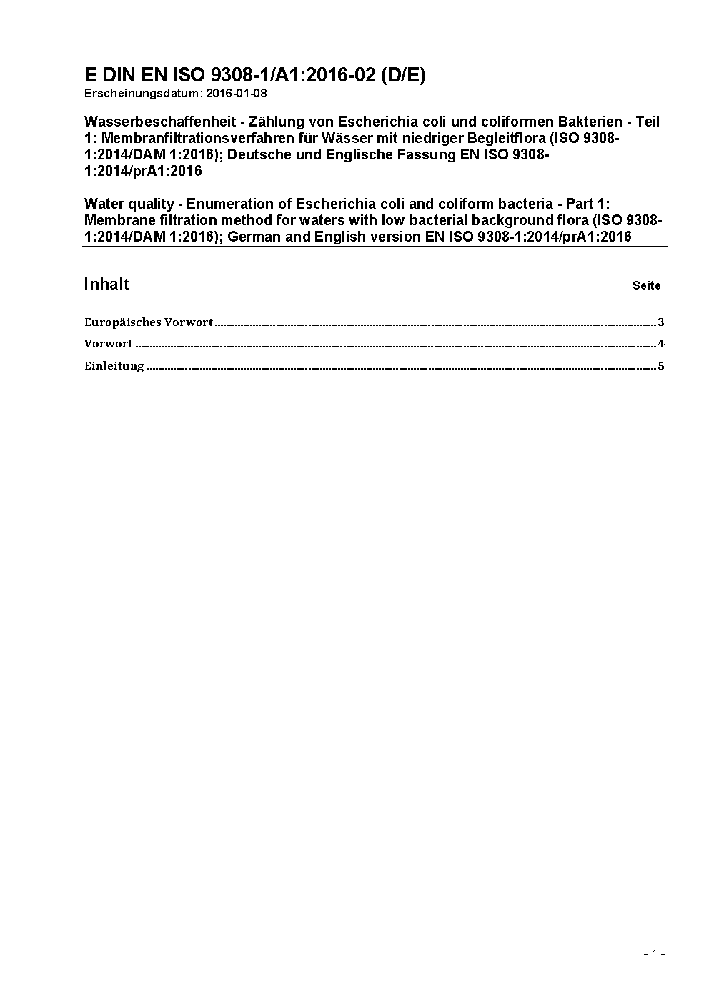 Wasserbeschaffenheit - Nachweis und Zählung von Escherichia coli und coliformen Bakterien - Teil 1: Membranfiltrationsverfahren (ISO/DIS 90308-1:1998); Deutsche Fassung prEN ISO 9308-1:1998