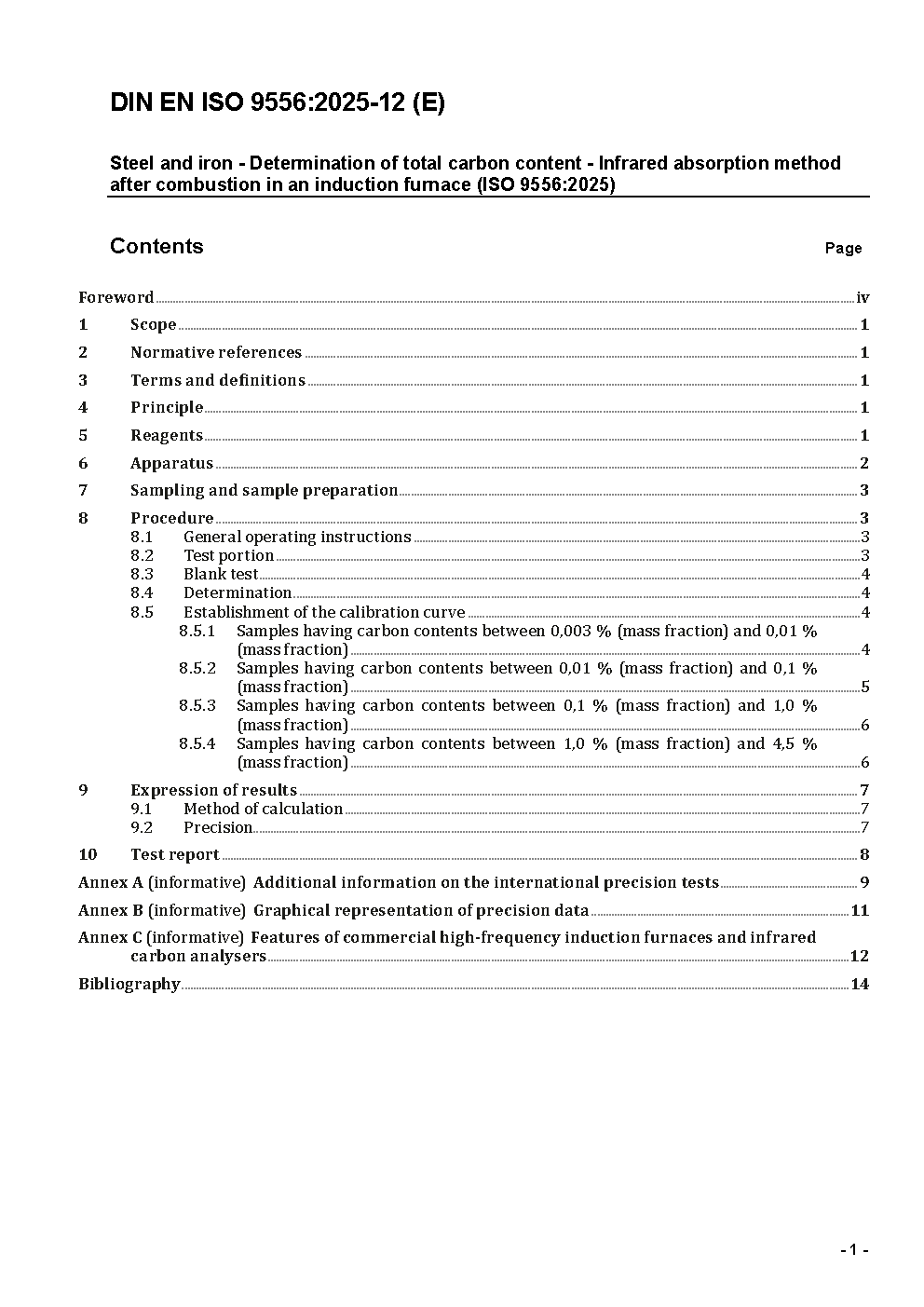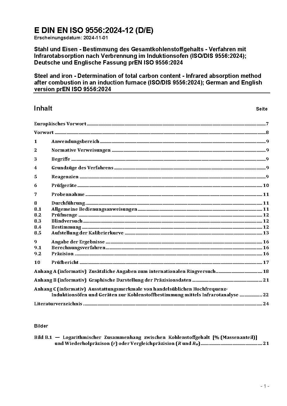 Steel and iron - Determination of total carbon content - Infrared absorption method after combustion in an induction furnace (ISO/DIS 9556:2024); German and English version prEN ISO 9556:2024