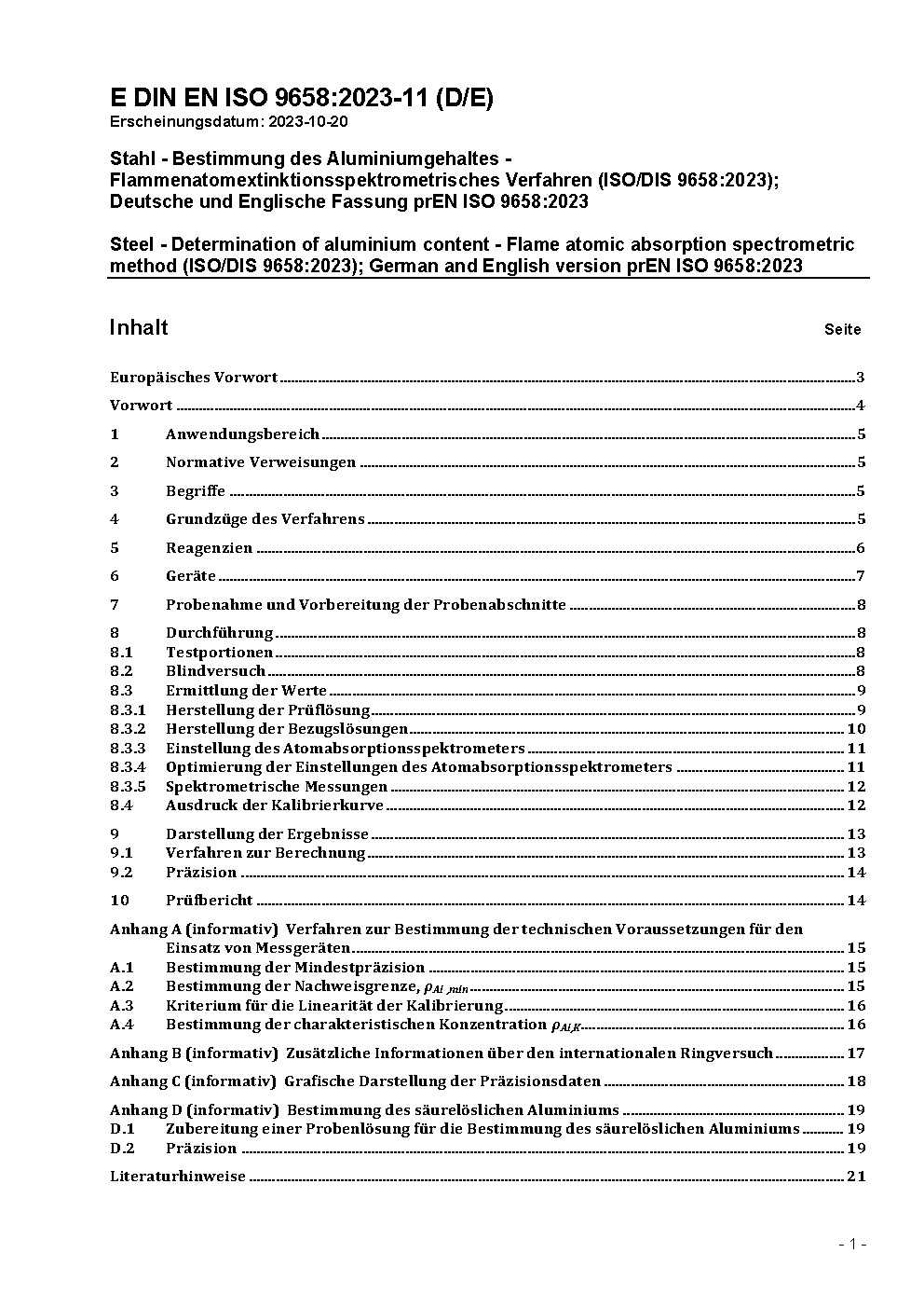 Stahl - Bestimmung des Aluminiumgehaltes - Flammenatomextinktionsspektrometrisches Verfahren (ISO/DIS 9658:2023); Deutsche und Englische Fassung prEN ISO 9658:2023