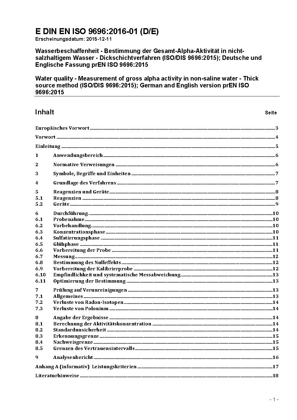 Water quality - Gross alpha activity - Test method using thick source (ISO 9696:2017); German version EN ISO 9696:2017