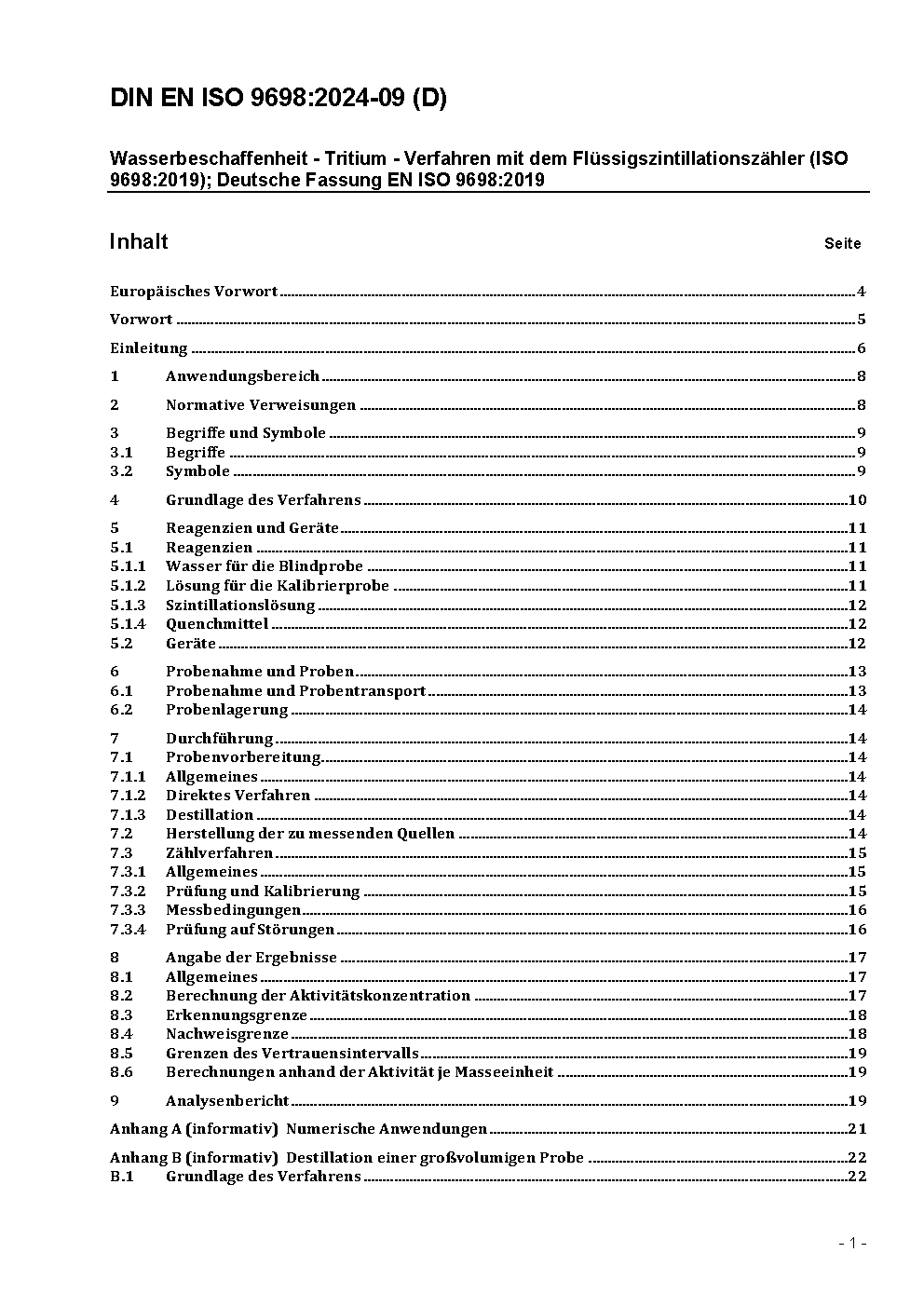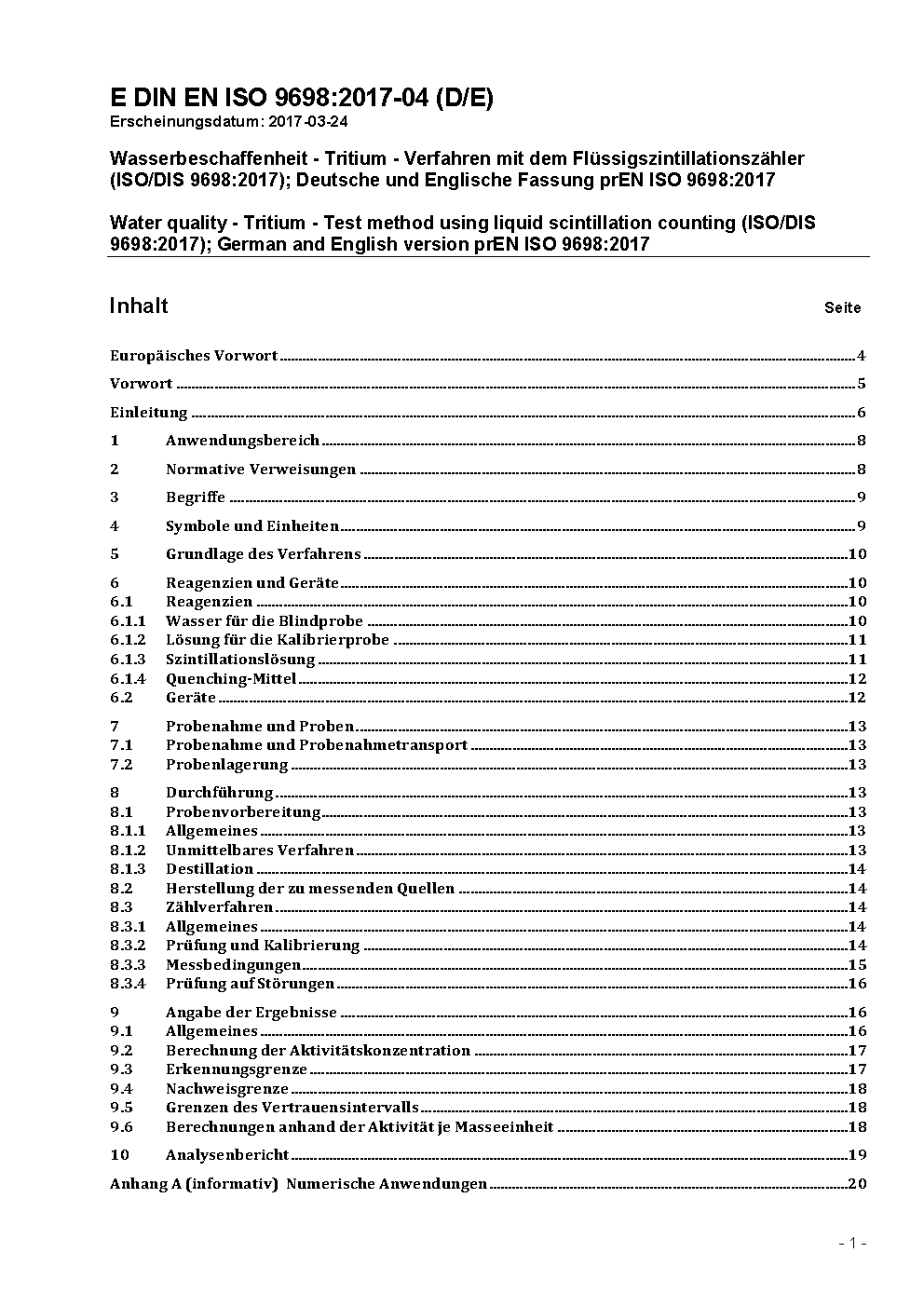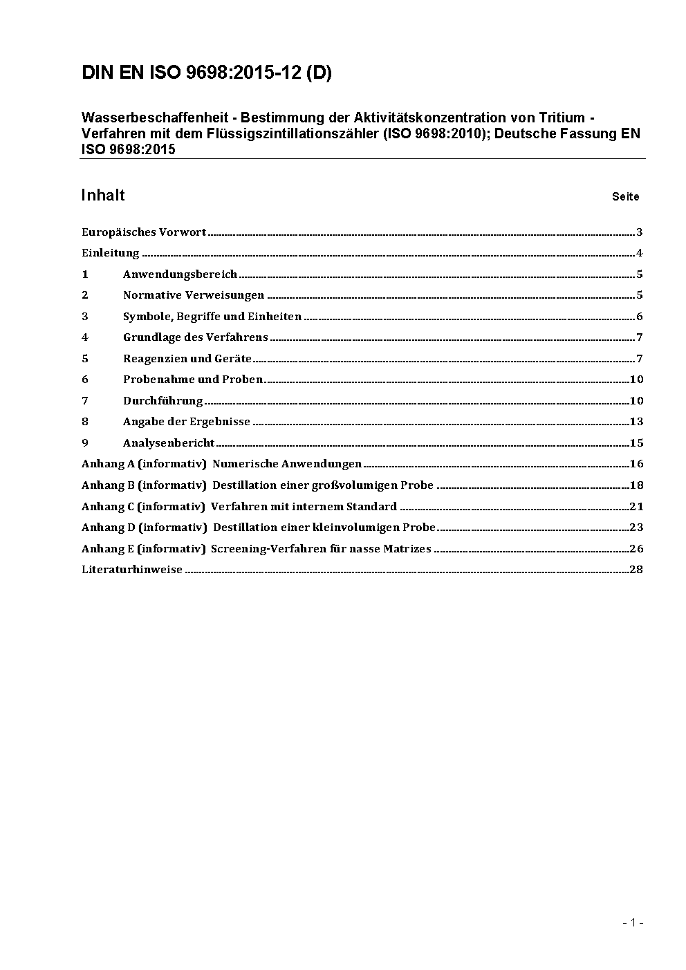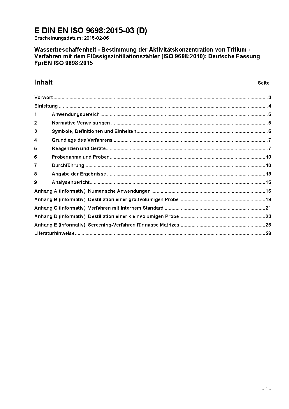 Wasserbeschaffenheit - Bestimmung der Aktivitätskonzentration von Tritium - Verfahren mit dem Flüssigszintillationszähler (ISO 9698:2010); Deutsche Fassung EN ISO 9698:2015