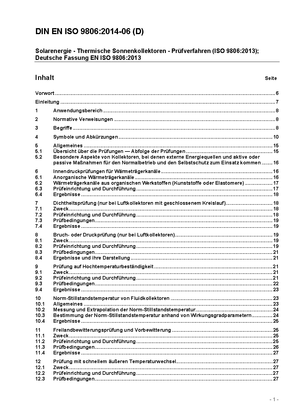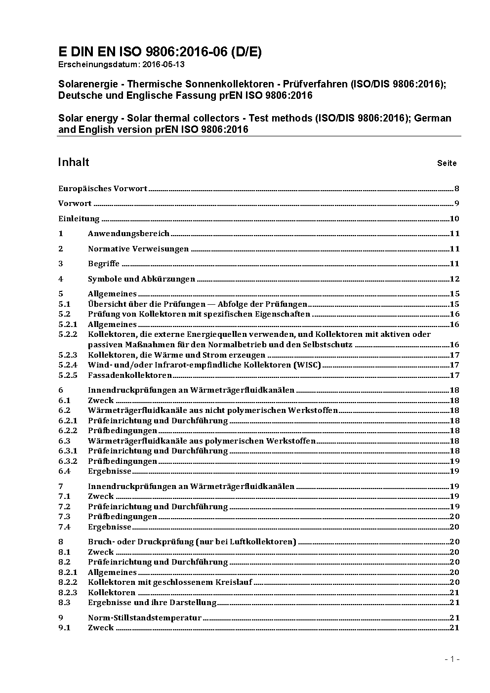 Solar energy - Solar thermal collectors - Test methods (ISO/DIS 9806:2016); German and English version prEN ISO 9806:2016