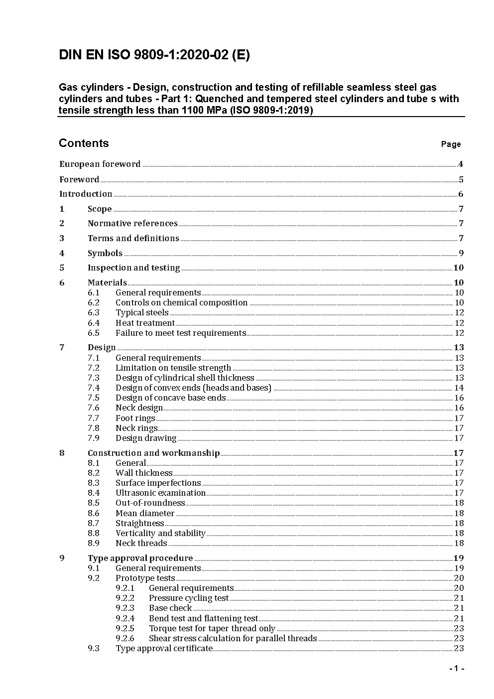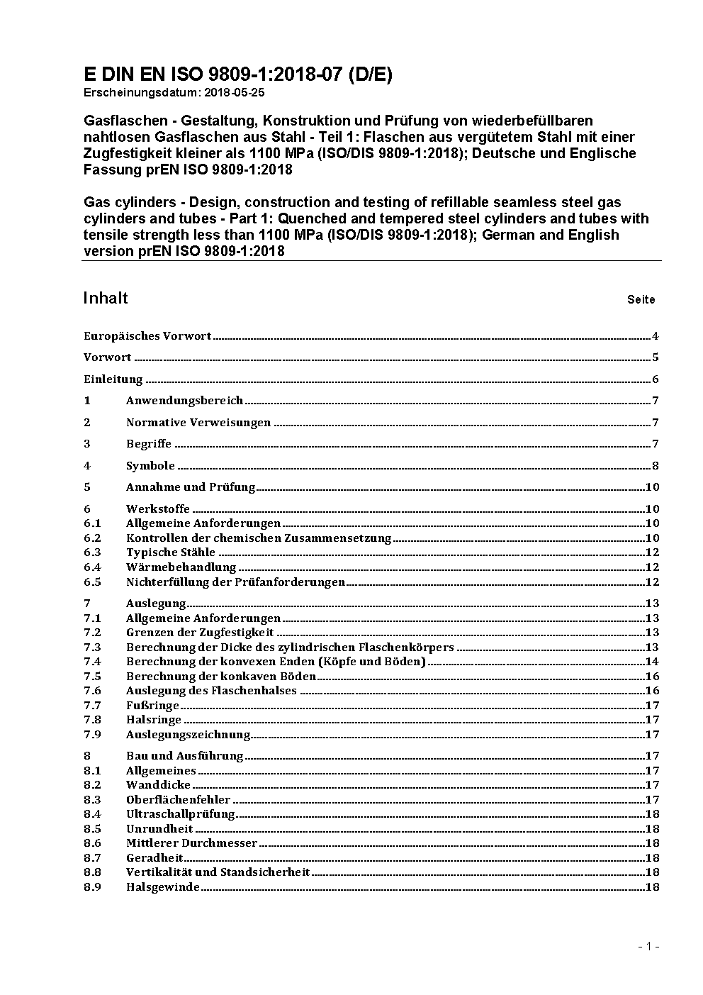 Gasflaschen - Gestaltung, Konstruktion und Prüfung von wiederbefüllbaren nahtlosen Gasflaschen aus Stahl - Teil 1: Flaschen aus vergütetem Stahl mit einer Zugfestigkeit kleiner als 1100 MPa (ISO/DIS 9809-1:2018); Deutsche und Englische Fassung prEN ISO 9809-1:2018