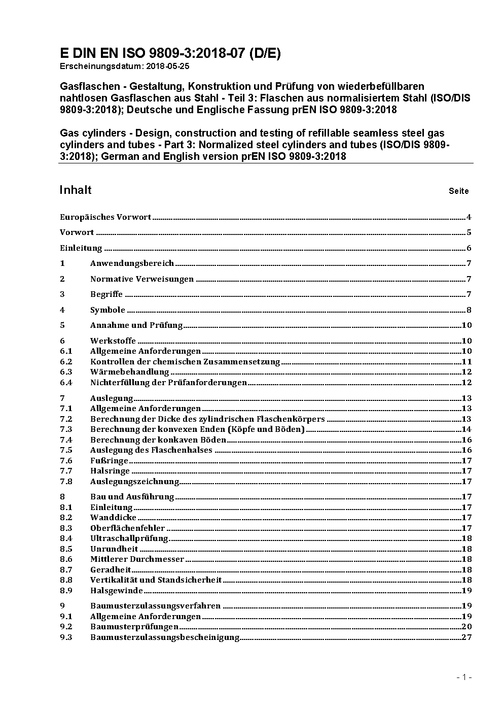 Gasflaschen - Gestaltung, Konstruktion und Prüfung von wiederbefüllbaren nahtlosen Gasflaschen aus Stahl - Teil 3: Flaschen aus normalisiertem Stahl (ISO/DIS 9809-3:2018); Deutsche und Englische Fassung prEN ISO 9809-3:2018