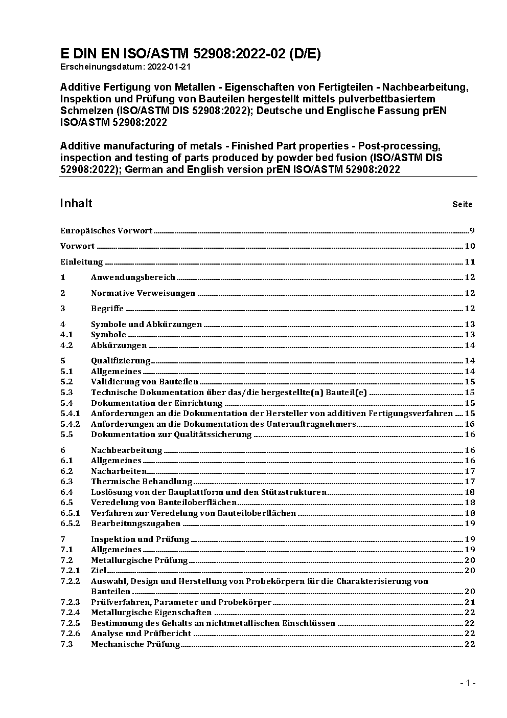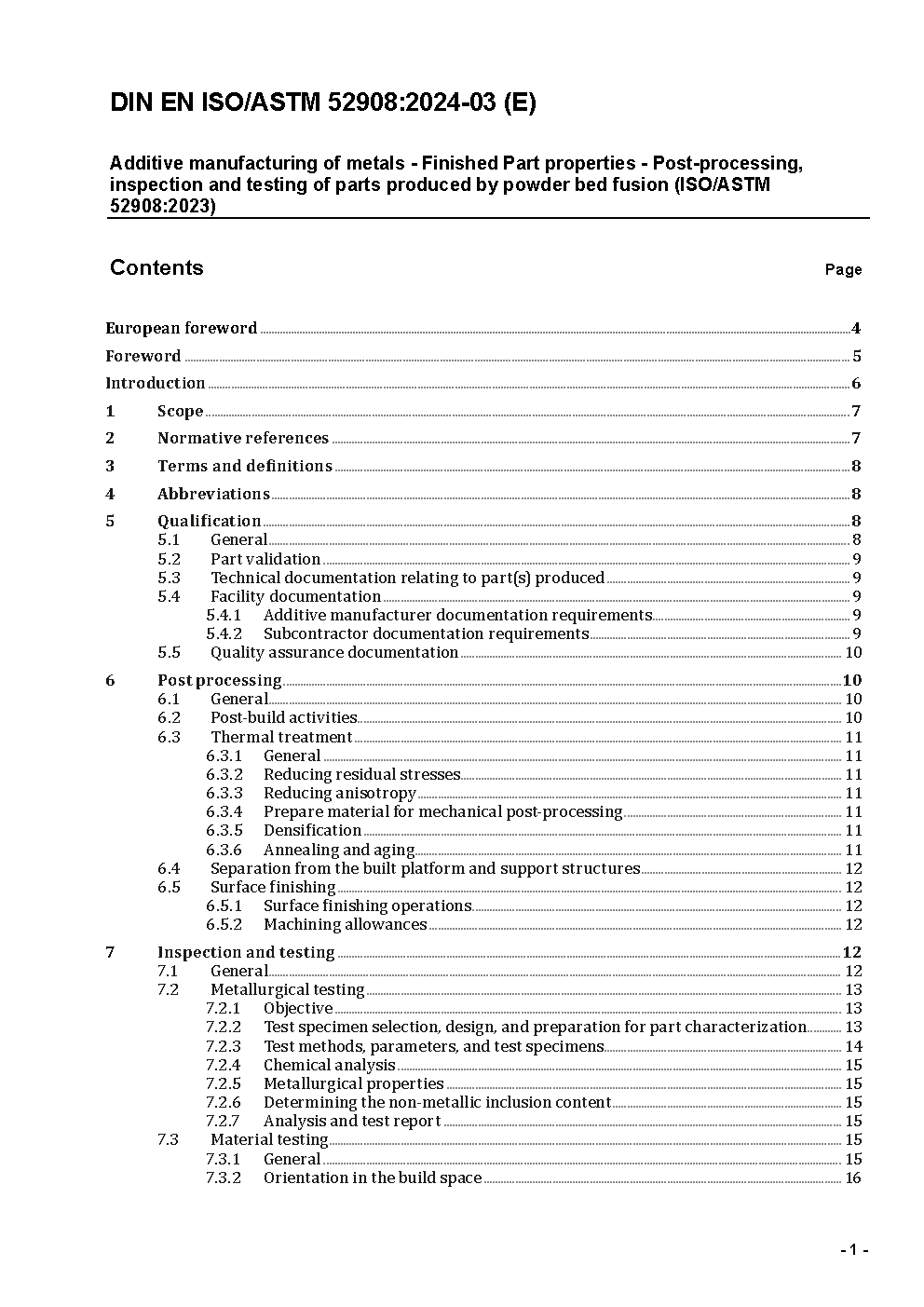Additive Fertigung von Metallen - Eigenschaften von Fertigteilen - Nachbearbeitung, Inspektion und Prüfung von Bauteilen hergestellt mittels pulverbettbasiertem Schmelzen (ISO/ASTM 52908:2023); Deutsche Fassung EN ISO/ASTM 52908:2023