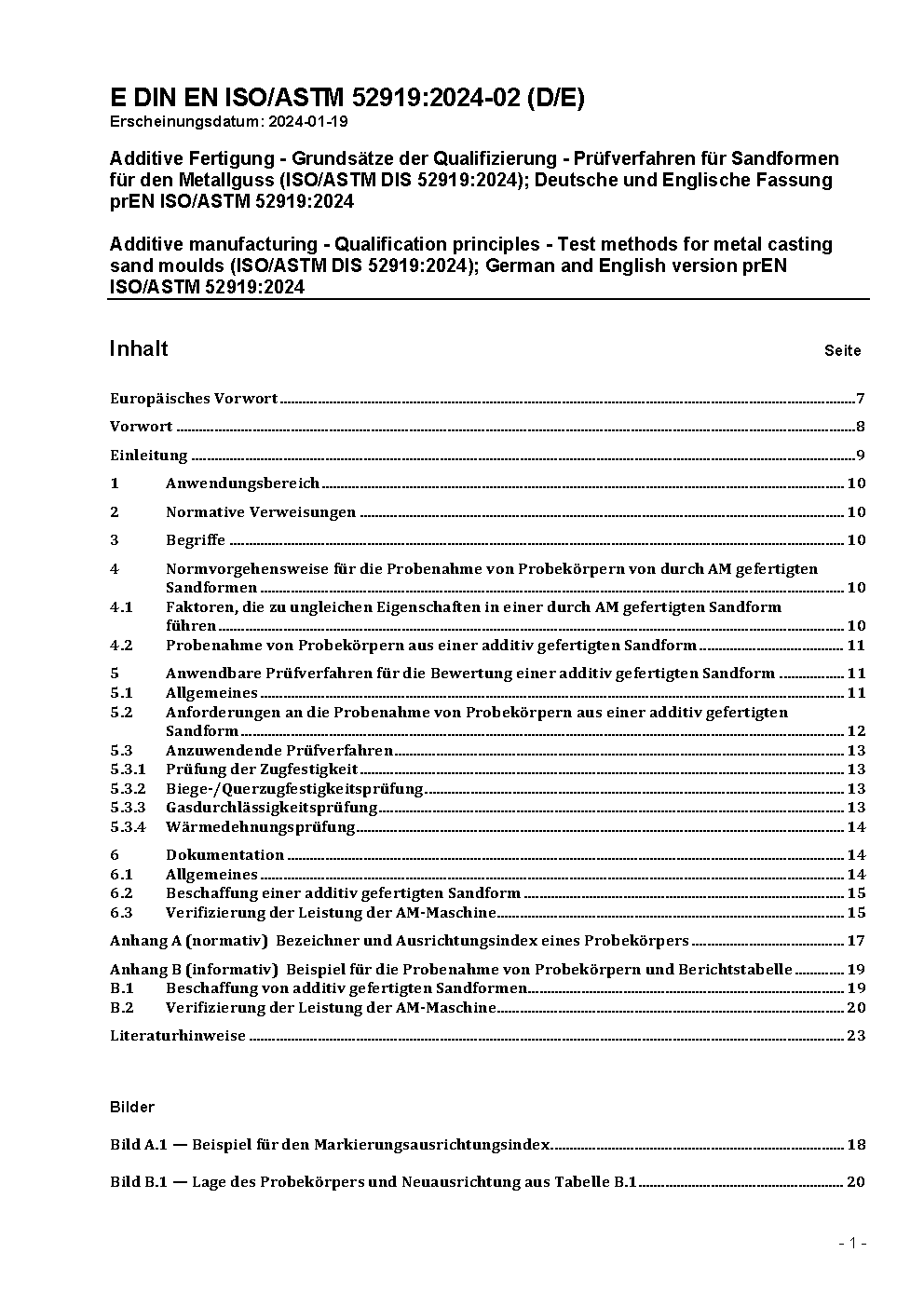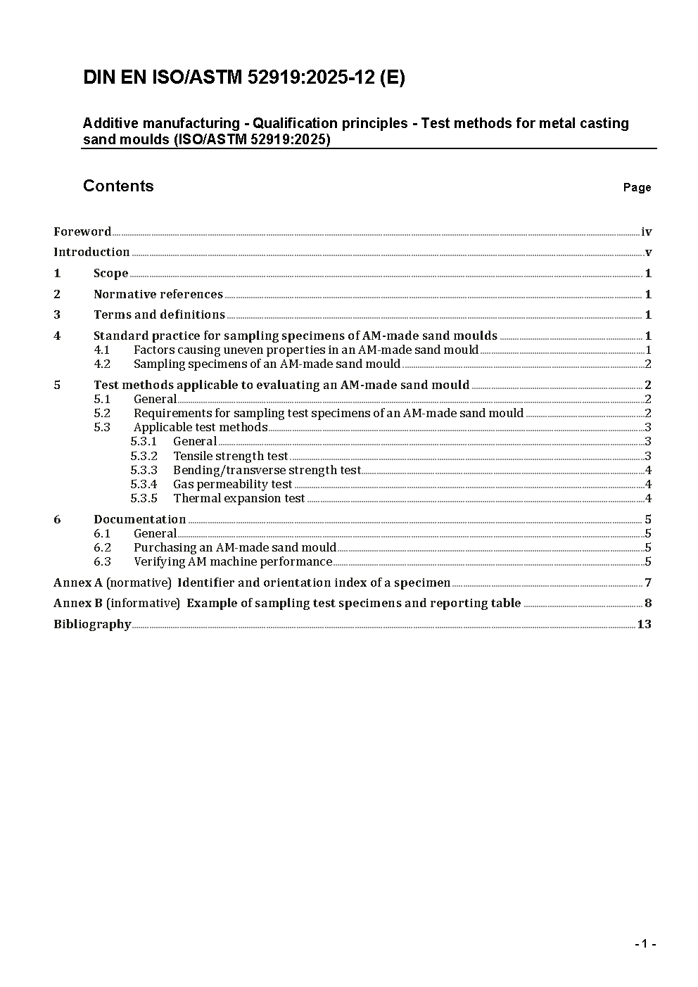 Additive Fertigung - Grundsätze der Qualifizierung - Prüfverfahren für Sandformen für den Metallguss (ISO/ASTM 52919:2025); Deutsche Fassung EN ISO/ASTM 52919:2025