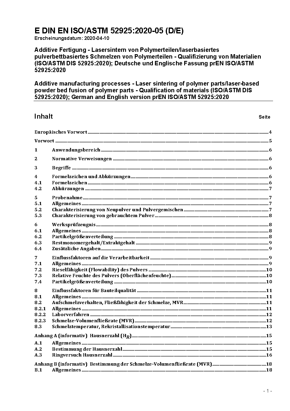 Additive Fertigung von Polymeren - Ausgangsmaterialien - Qualifizierung von Materialien für das laserbasierte Pulverbettschmelzen von Teilen (ISO/ASTM 52925:2022); Deutsche Fassung EN ISO/ASTM 52925:2022
