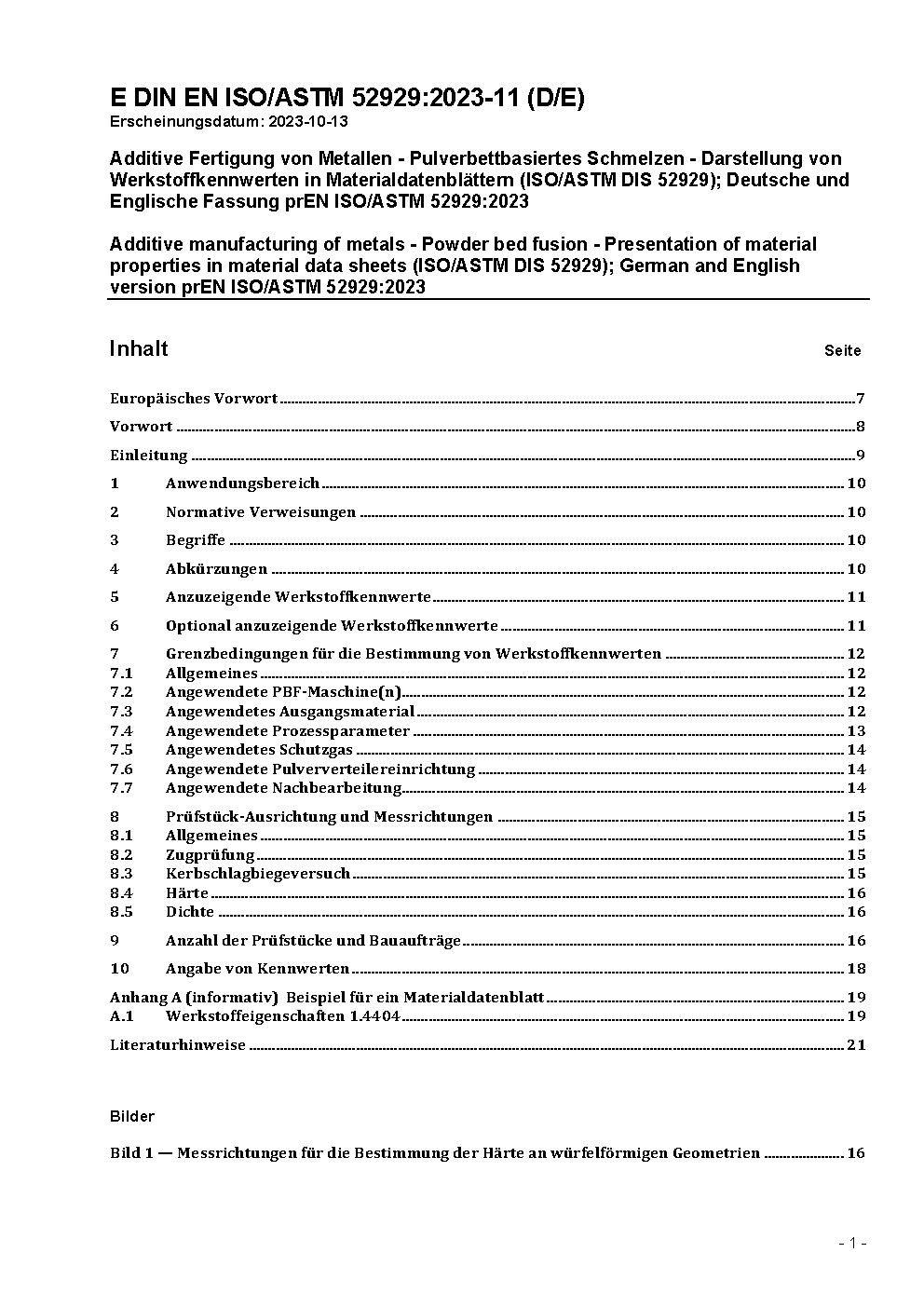 Additive Fertigung von Metallen - Pulverbettbasiertes Schmelzen - Darstellung von Werkstoffkennwerten in Materialdatenblättern (ISO/ASTM DIS 52929:2023); Deutsche und Englische Fassung prEN ISO/ASTM 52929:2023