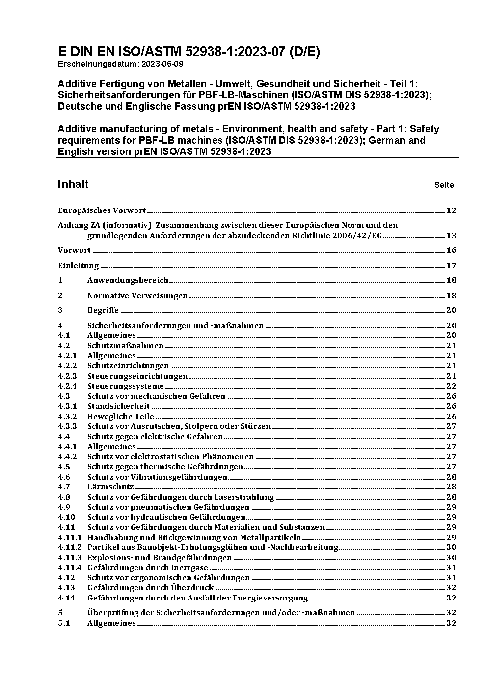 Additive manufacturing of metals - Environment, health and safety - Part 1: Safety requirements for PBF-LB machines (ISO/ASTM 52938-1:2025); German version EN ISO/ASTM 52938-1:2025
