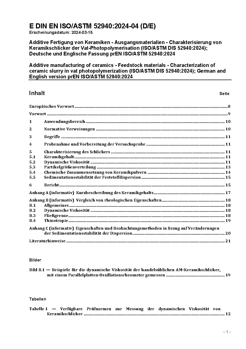 Additive manufacturing of ceramics - Feedstock materials - Characterization of ceramic slurry in vat photopolymerization (ISO/ASTM DIS 52940:2024); German and English version prEN ISO/ASTM 52940:2024