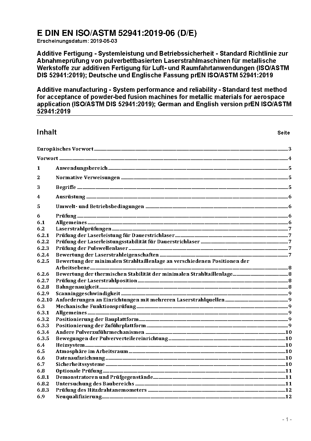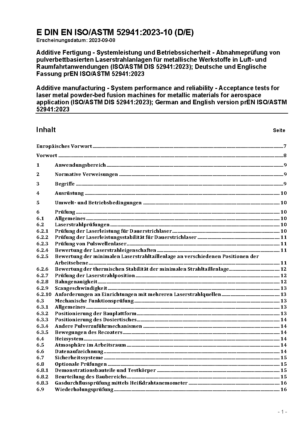 Additive manufacturing - System performance and reliability - Acceptance tests for laser metal powder-bed fusion machines for metallic materials for aerospace application (ISO/ASTM DIS 52941:2023); German and English version prEN ISO/ASTM 52941:2023