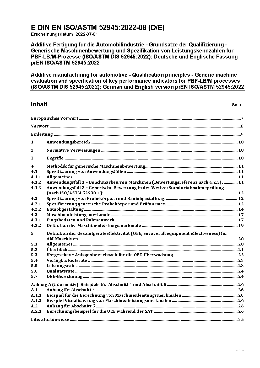 Additive manufacturing for automotive - Qualification principles - Generic machine evaluation and specification of key performance indicators for PBF-LB/M processes (ISO/ASTM DIS 52945:2022); German and English version prEN ISO/ASTM 52945:2022