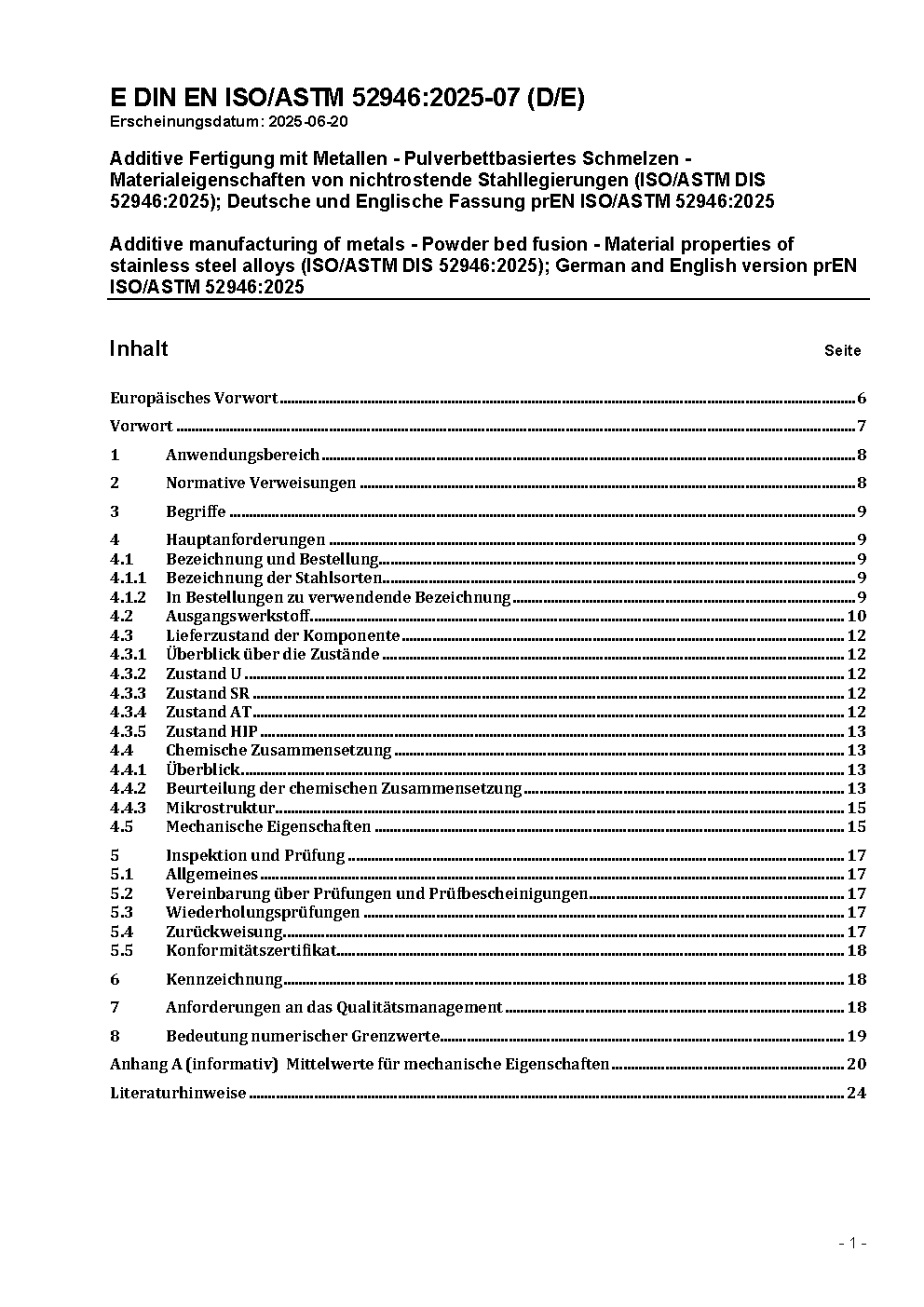 Additive Fertigung mit Metallen - Pulverbettbasiertes Schmelzen - Materialeigenschaften von nichtrostende Stahllegierungen (ISO/ASTM DIS 52946:2025); Deutsche und Englische Fassung prEN ISO/ASTM 52946:2025