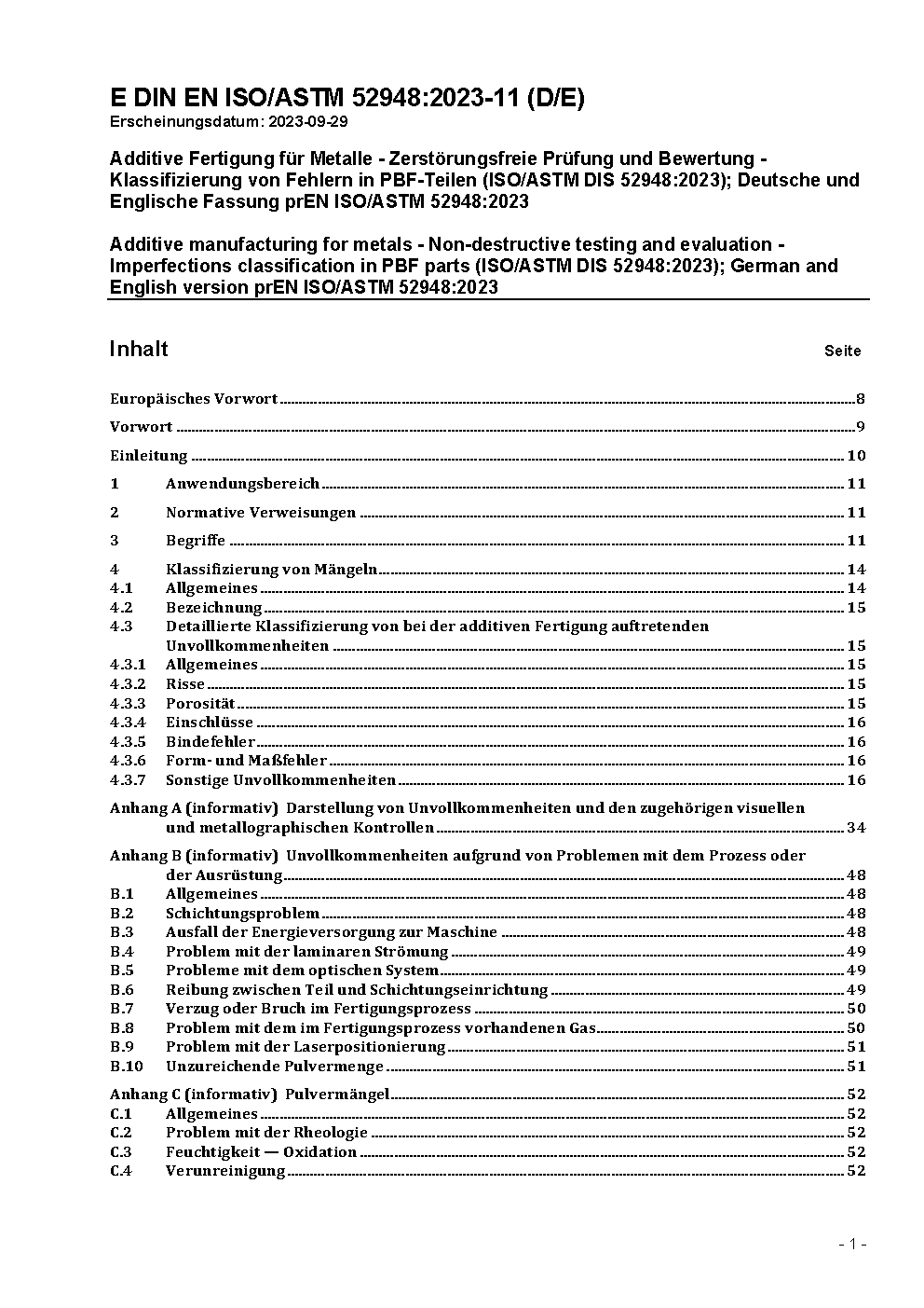 Additive Fertigung für Metalle - Zerstörungsfreie Prüfung und Bewertung - Klassifizierung von Fehlern in PBF-Teilen (ISO/ASTM DIS 52948:2023); Deutsche und Englische Fassung prEN ISO/ASTM 52948:2023