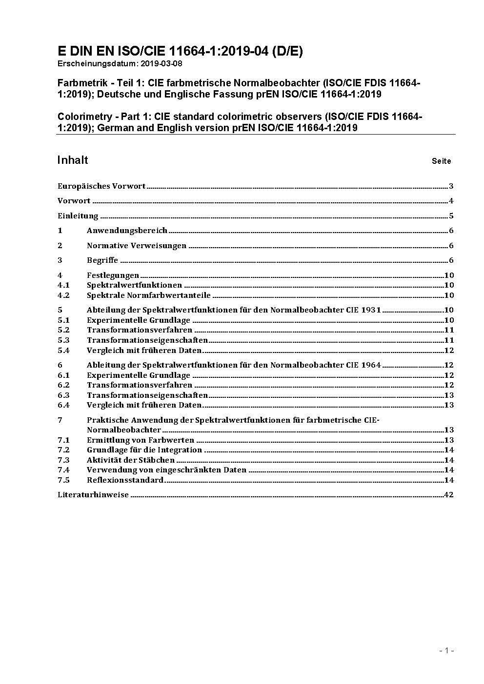 Farbmetrik - Teil 1: CIE farbmetrische Normalbeobachter (ISO/CIE 11664-1:2019); Deutsche Fassung EN ISO/CIE 11664-1:2019
