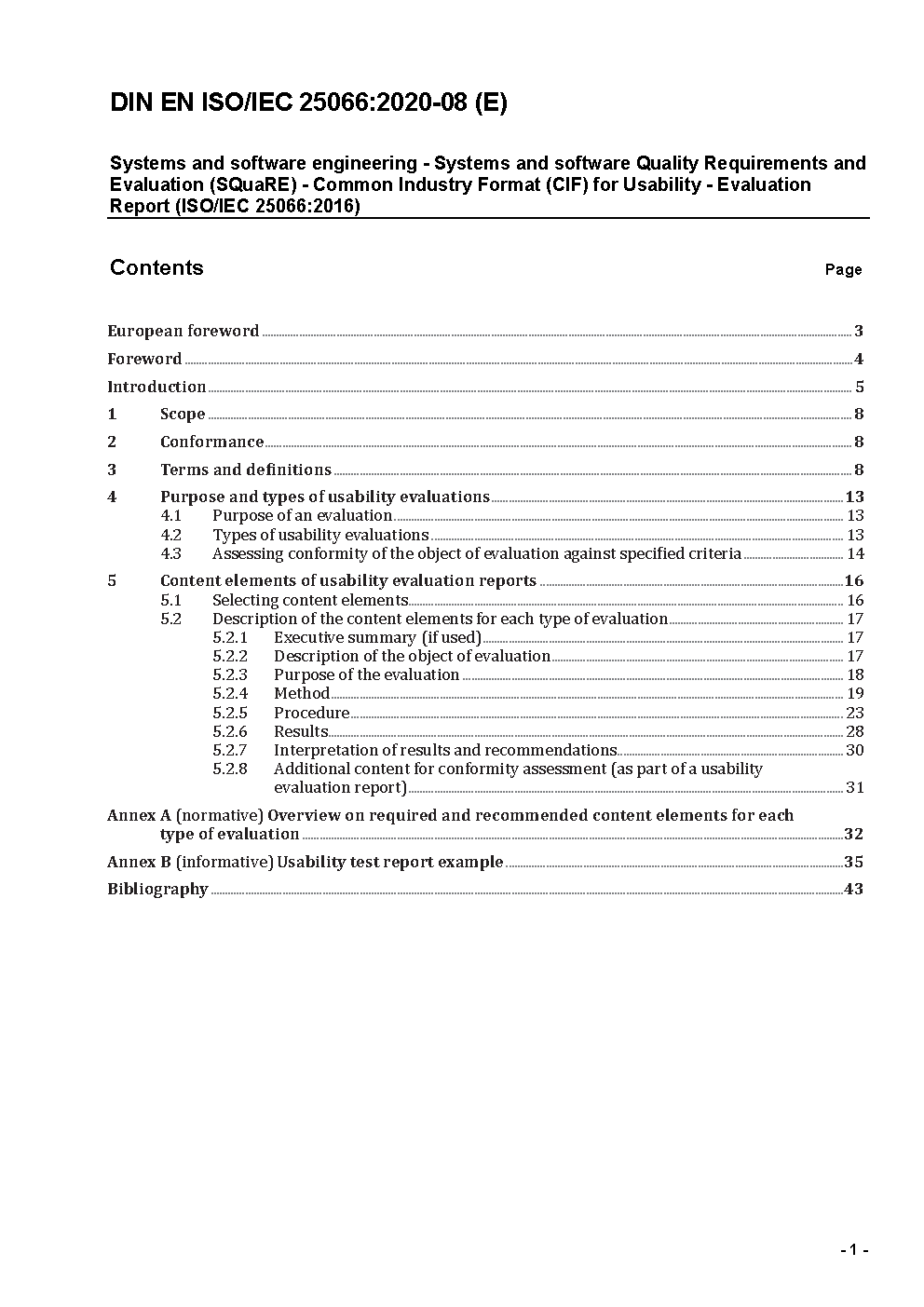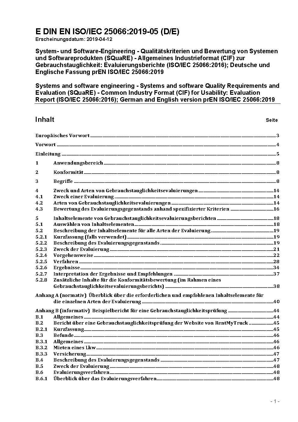 Systems and software engineering - Systems and software Quality Requirements and Evaluation (SQuaRE) - Common Industry Format (CIF) for Usability: Evaluation Report (ISO/IEC 25066:2016); German and English version prEN ISO/IEC 25066:2019