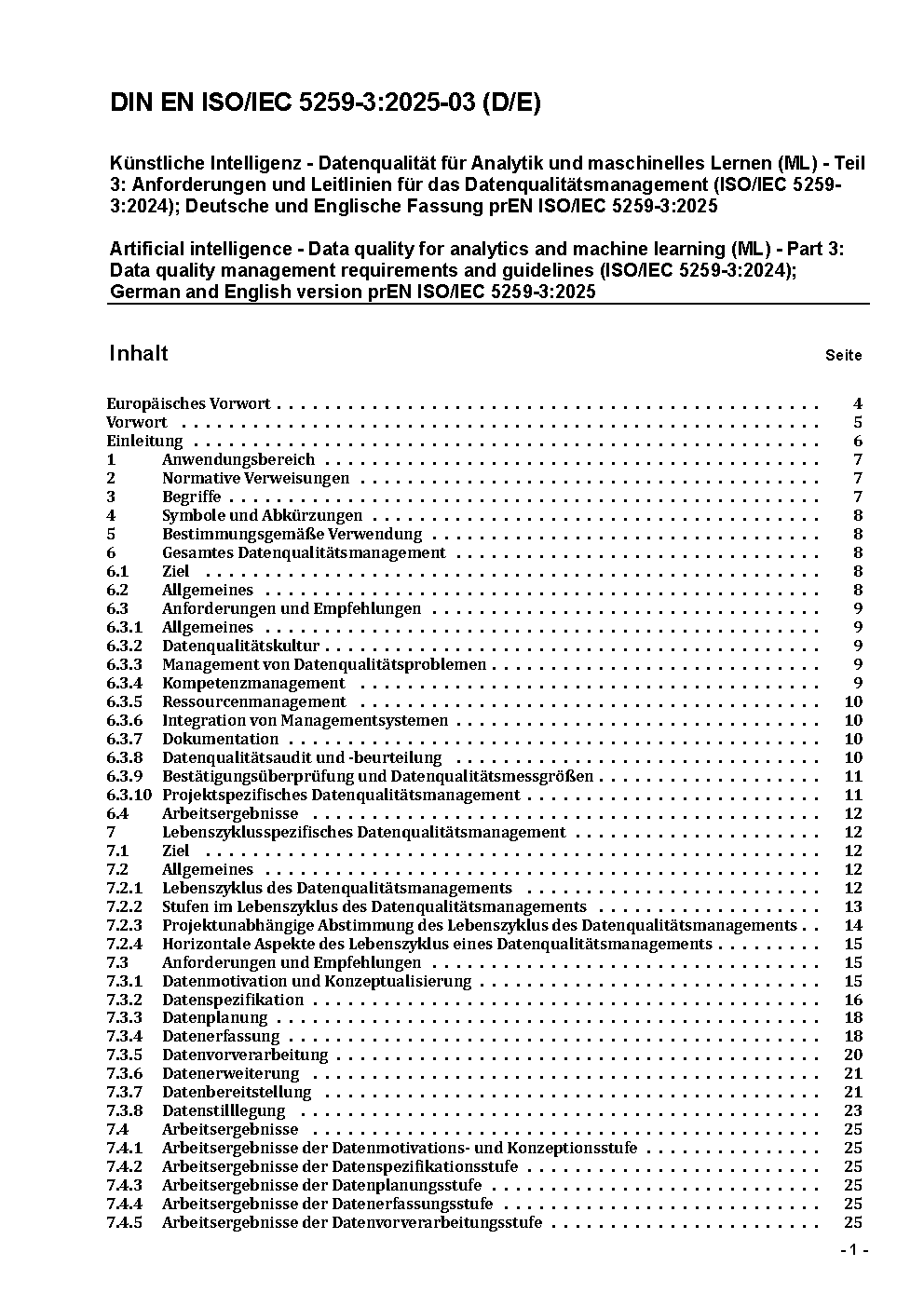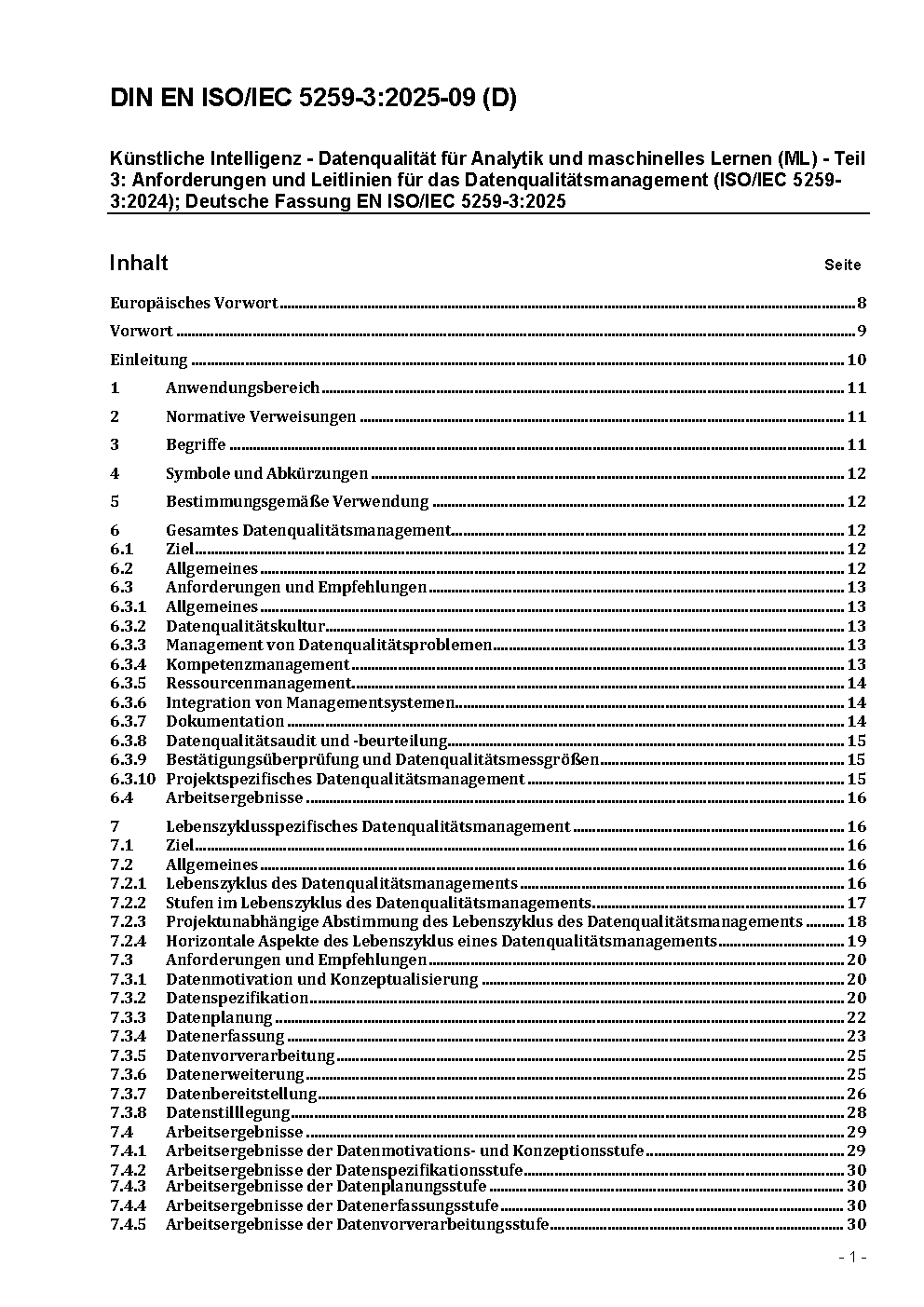 Artificial intelligence - Data quality for analytics and machine learning (ML) - Part 3: Data quality management requirements and guidelines (ISO/IEC 5259-3:2024); German version EN ISO/IEC 5259-3:2025