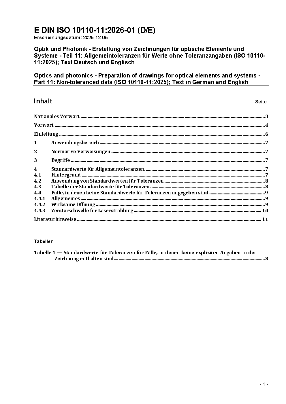 Optik und optische Instrumente - Erstellung von Zeichnungen für optische Elemente und Systeme - Teil 11: Allgemeintoleranzen für Werte ohne Toleranzangabe (ISO 10110-11:1996)