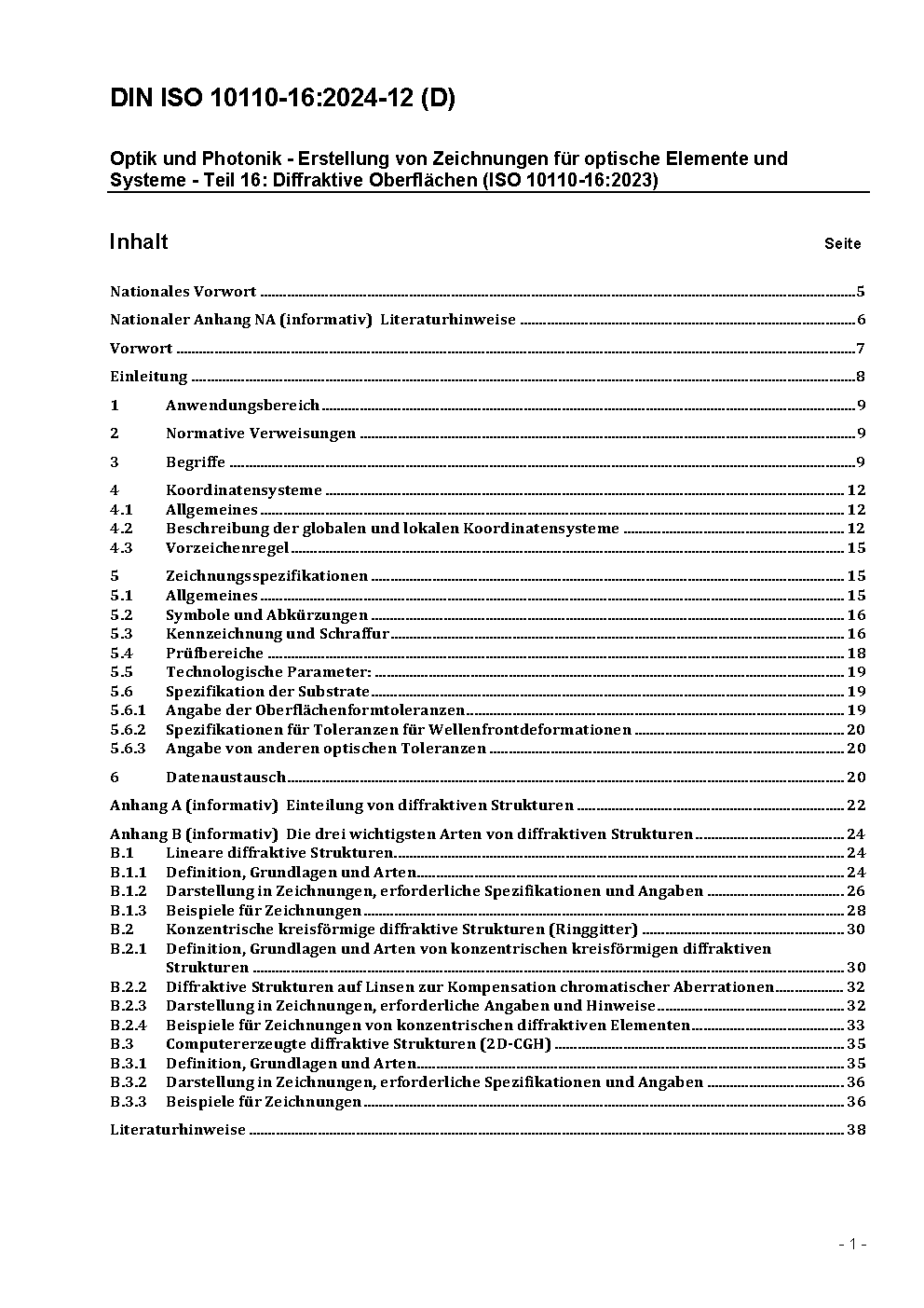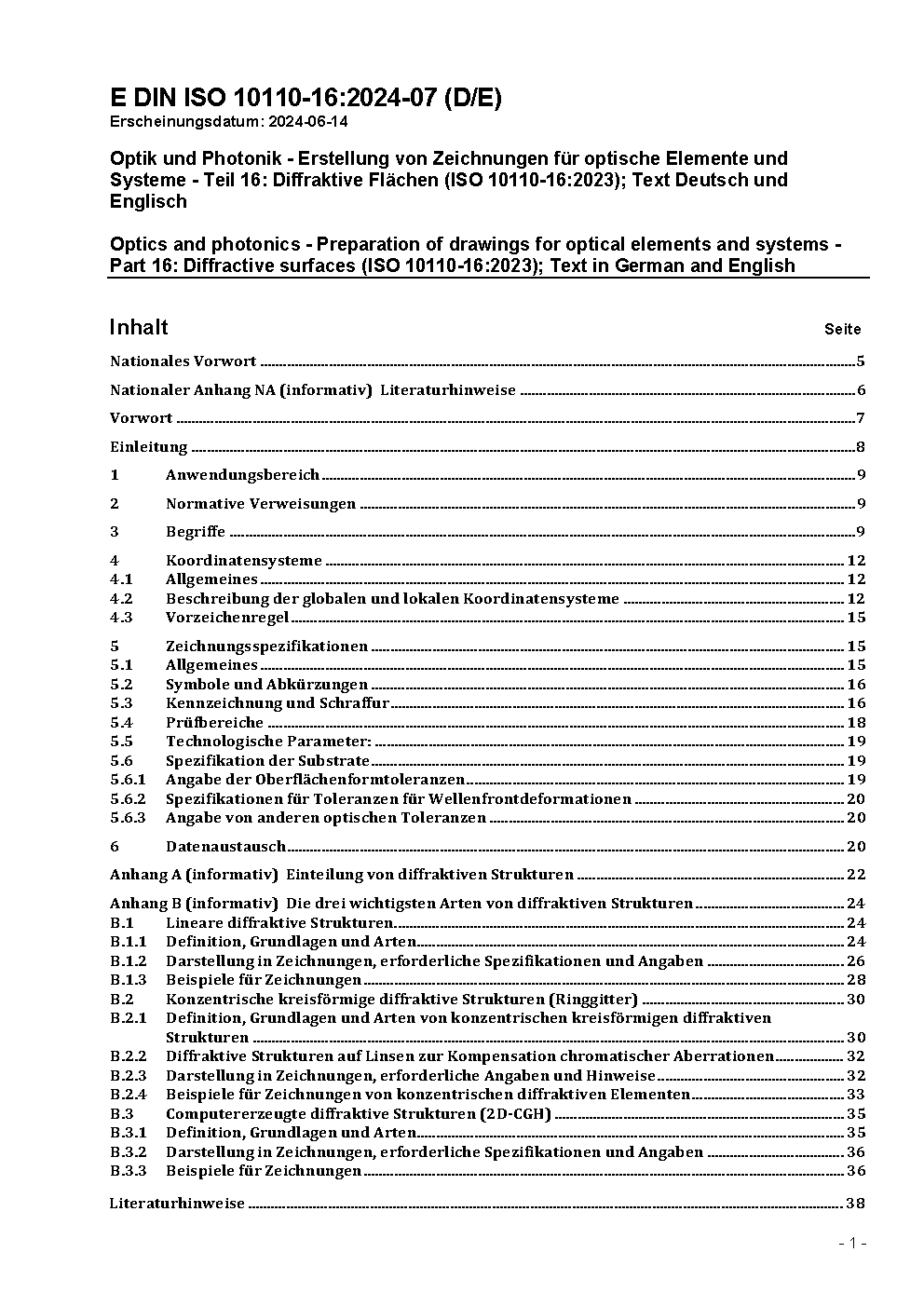 Optik und Photonik - Erstellung von Zeichnungen für optische Elemente und Systeme - Teil 16: Diffraktive Flächen (ISO 10110-16:2023); Text Deutsch und Englisch
