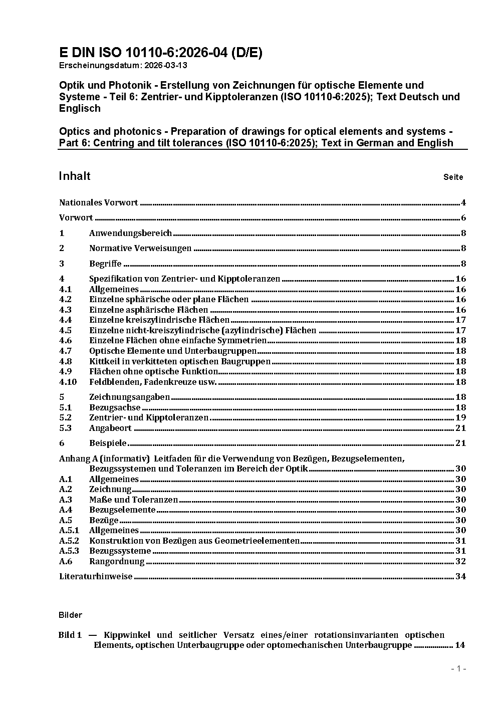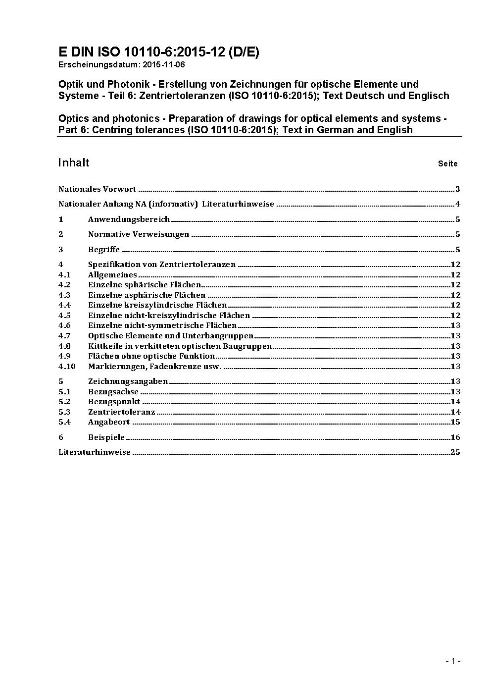 Optik und Photonik - Erstellung von Zeichnungen für optische Elemente und Systeme - Teil 6: Zentrier- und Kipptoleranzen (ISO 10110-6:2025); Text Deutsch und Englisch