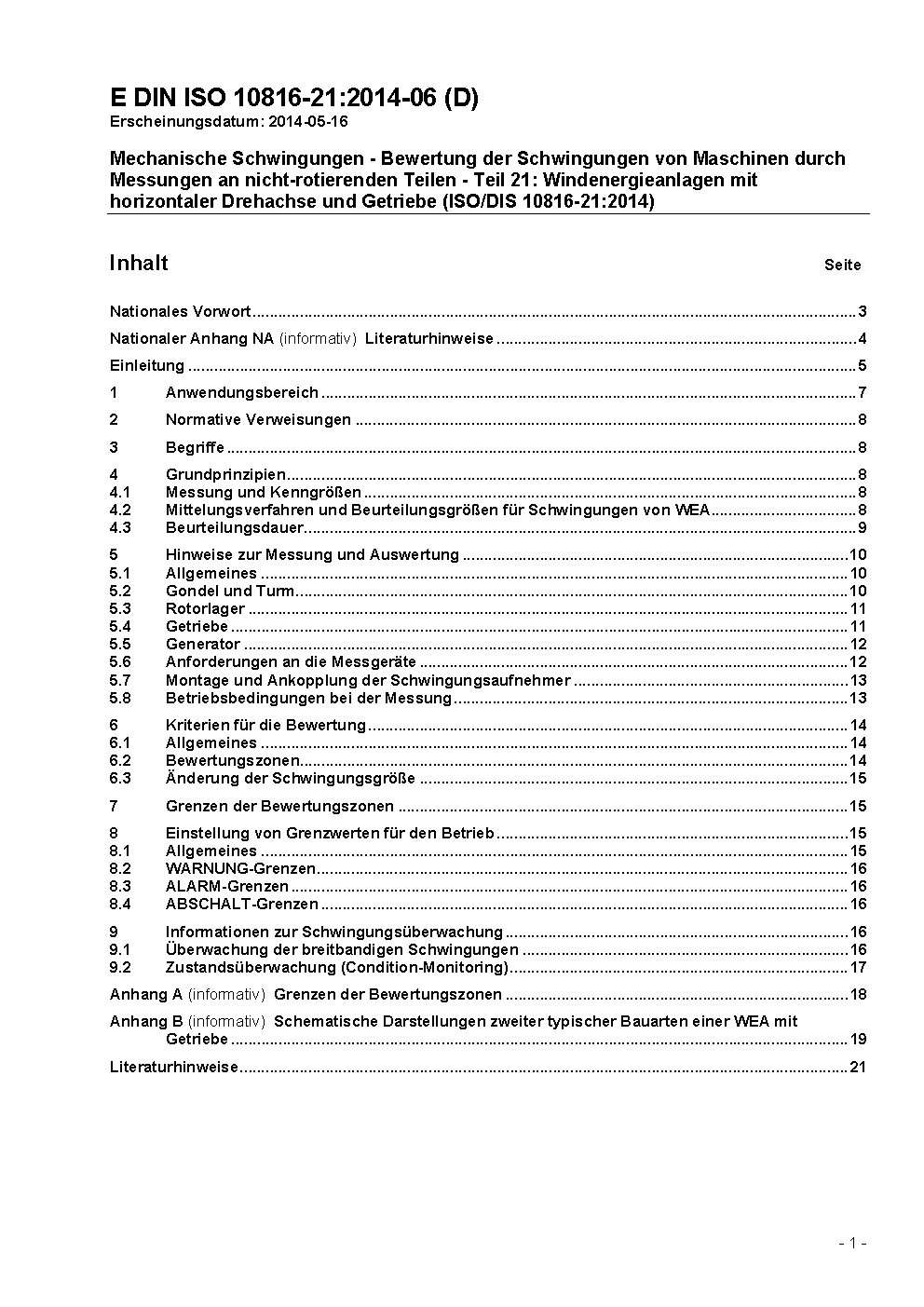 Mechanische Schwingungen - Bewertung der Schwingungen von Maschinen durch Messungen an nicht-rotierenden Teilen - Teil 21: Windenergieanlagen mit horizontaler Drehachse und Getriebe (ISO/DIS 10816-21:2014)