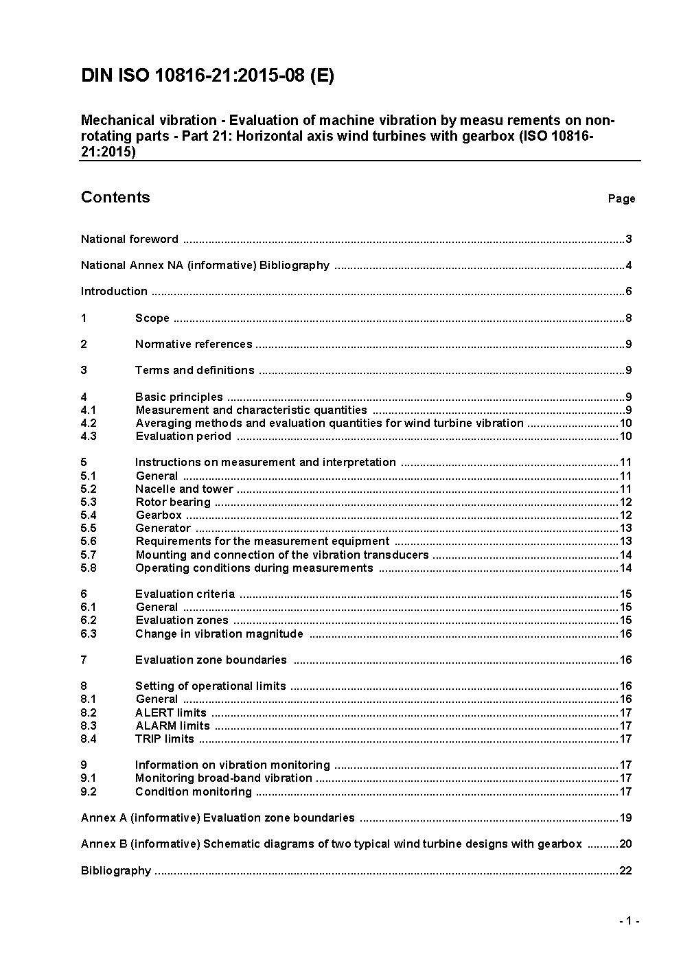 Mechanical vibration - Evaluation of machine vibration by measurements on non-rotating parts - Part 21: Horizontal axis wind turbines with gearbox (ISO/DIS 10816-21:2014)