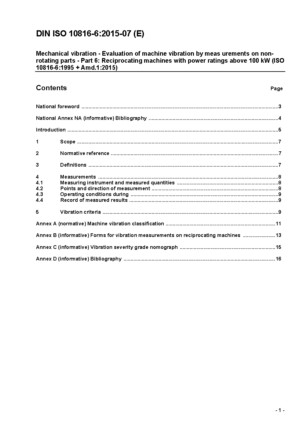 Mechanische Schwingungen - Bewertung der Schwingungen von Maschinen durch Messungen an nicht-rotierenden Teilen - Teil 6: Hubkolbenmaschinen mit Leistungen über 100 kW (ISO 10816-6:1995)