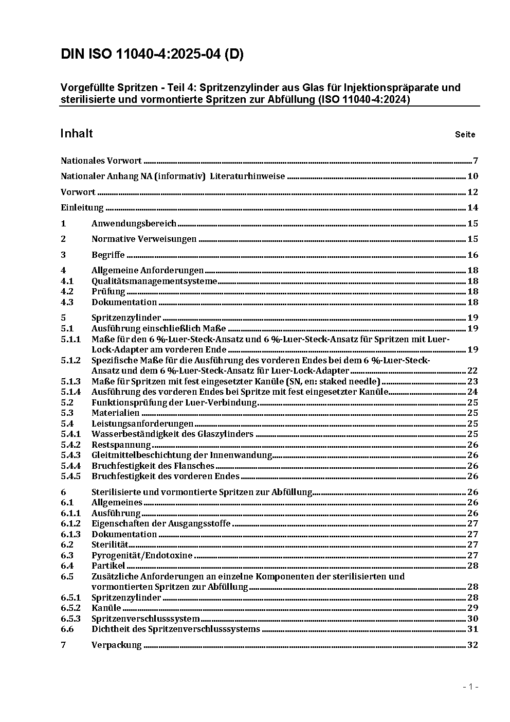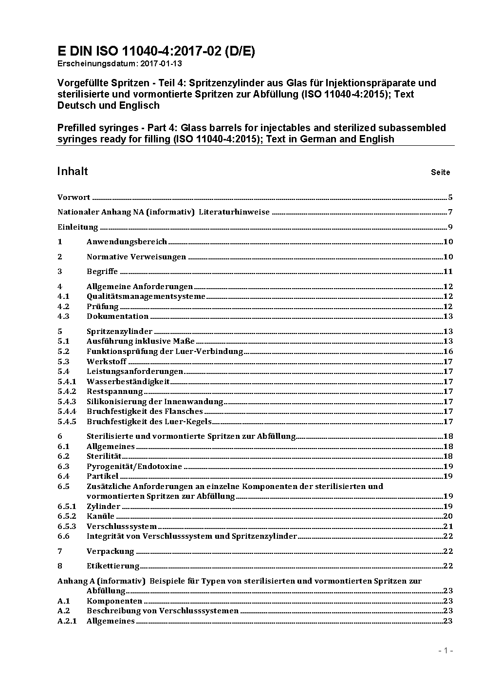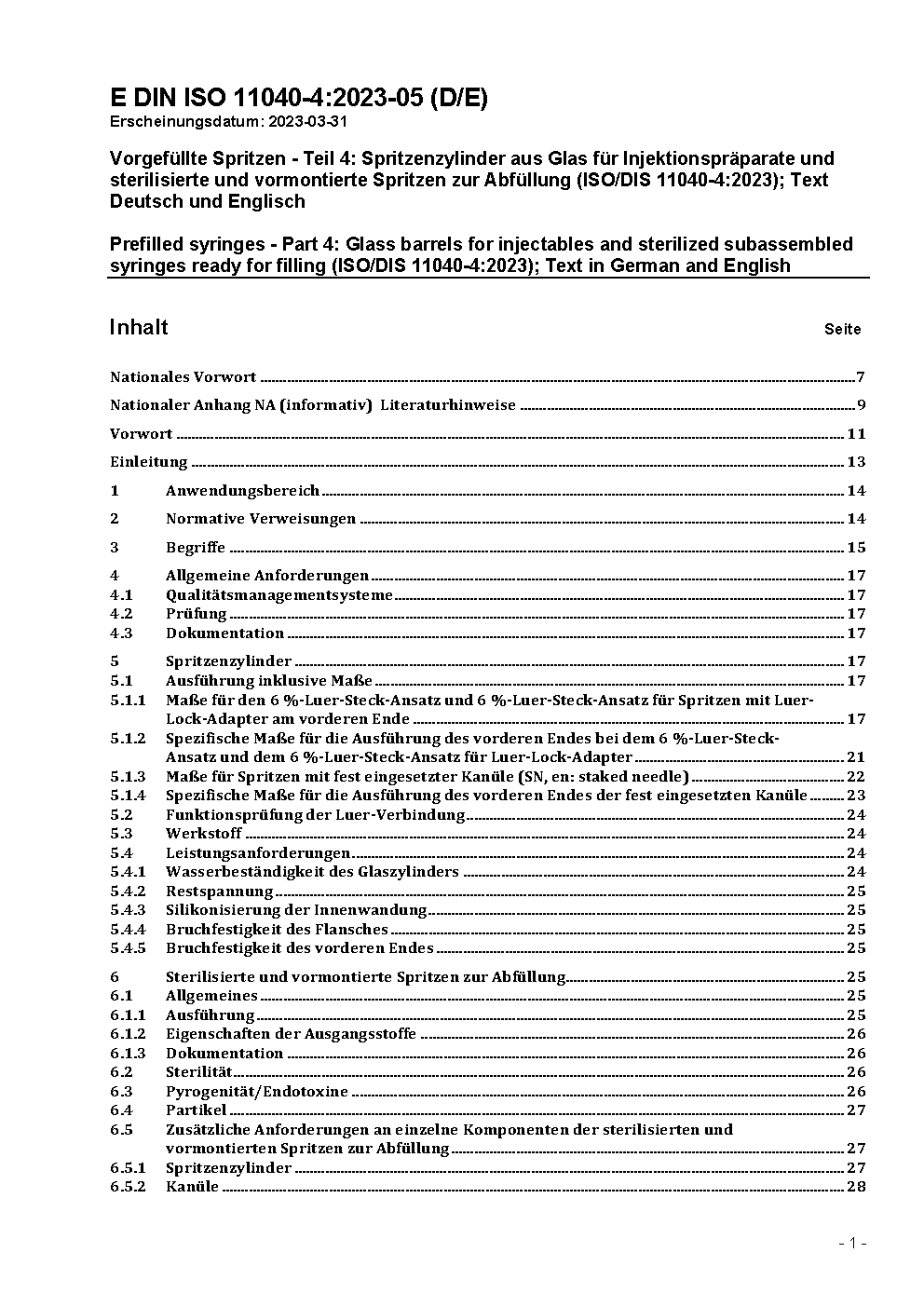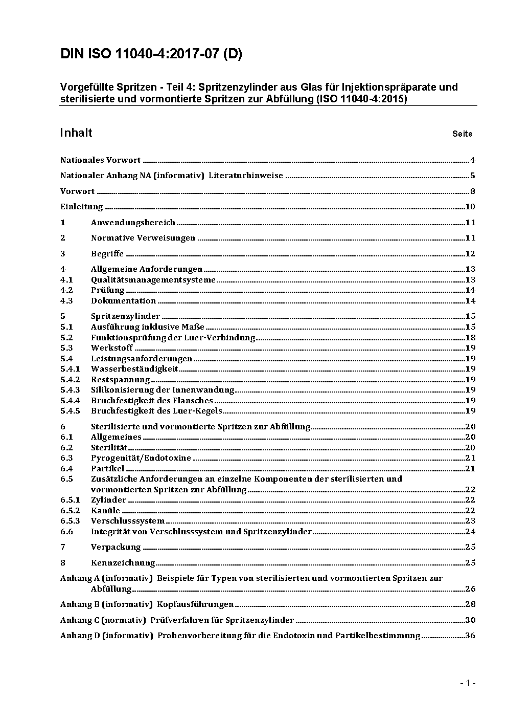 Vorgefüllte Spritzen - Teil 4: Spritzenzylinder aus Glas für Injektionspräparate und sterilisierte und vormontierte Spritzen zur Abfüllung (ISO 11040-4:2015)