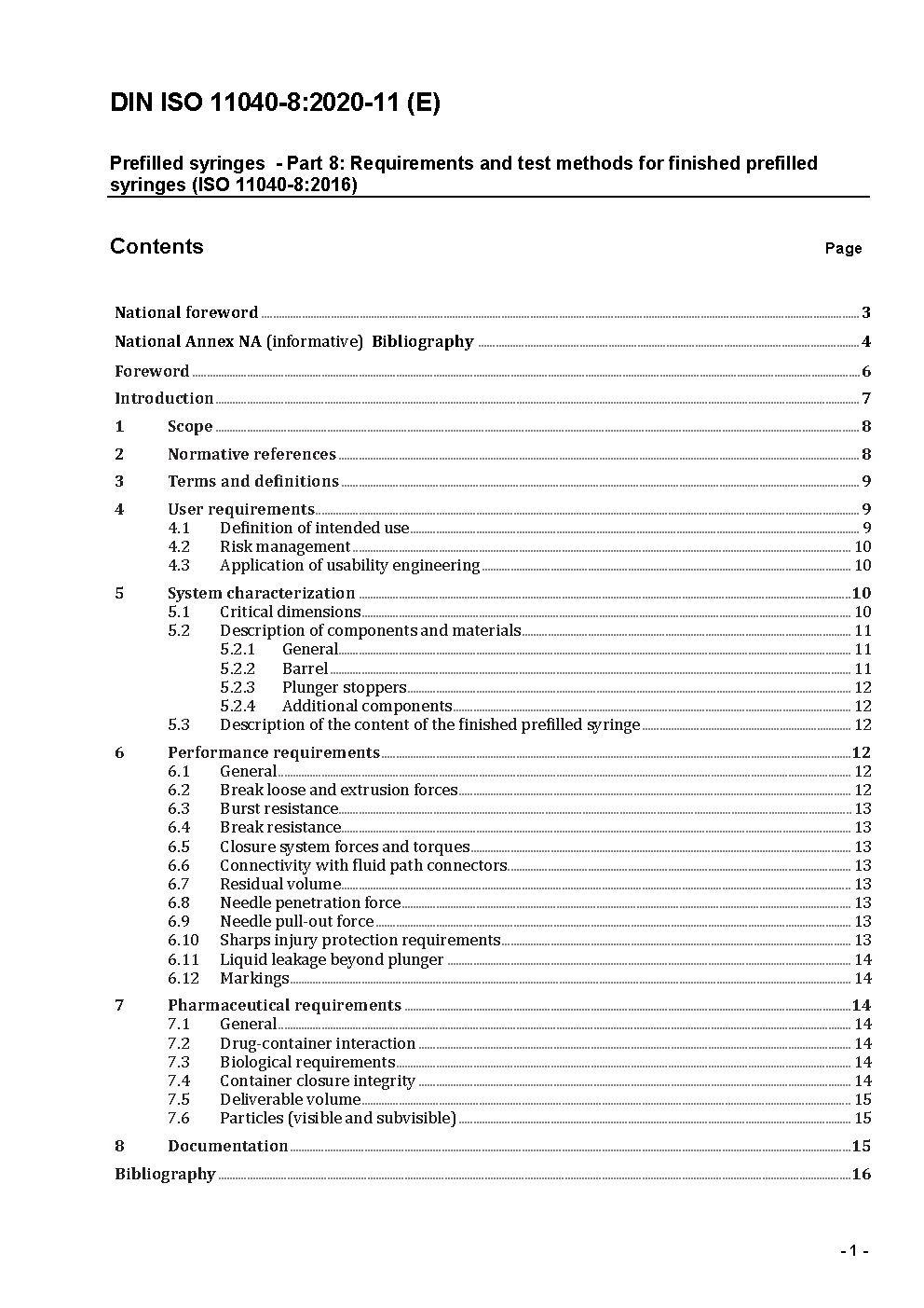 Prefilled syringes - Part 8: Requirements and test methods for finished prefilled syringes (ISO 11040-8:2016); Text in German and English