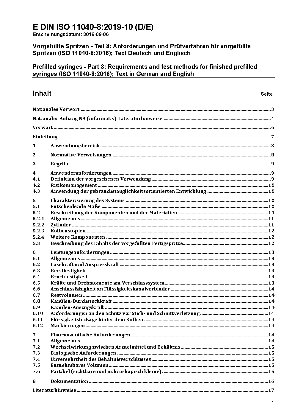 Vorgefüllte Spritzen - Teil 8: Anforderungen und Prüfverfahren für vorgefüllte Spritzen (ISO 11040-8:2016); Text Deutsch und Englisch