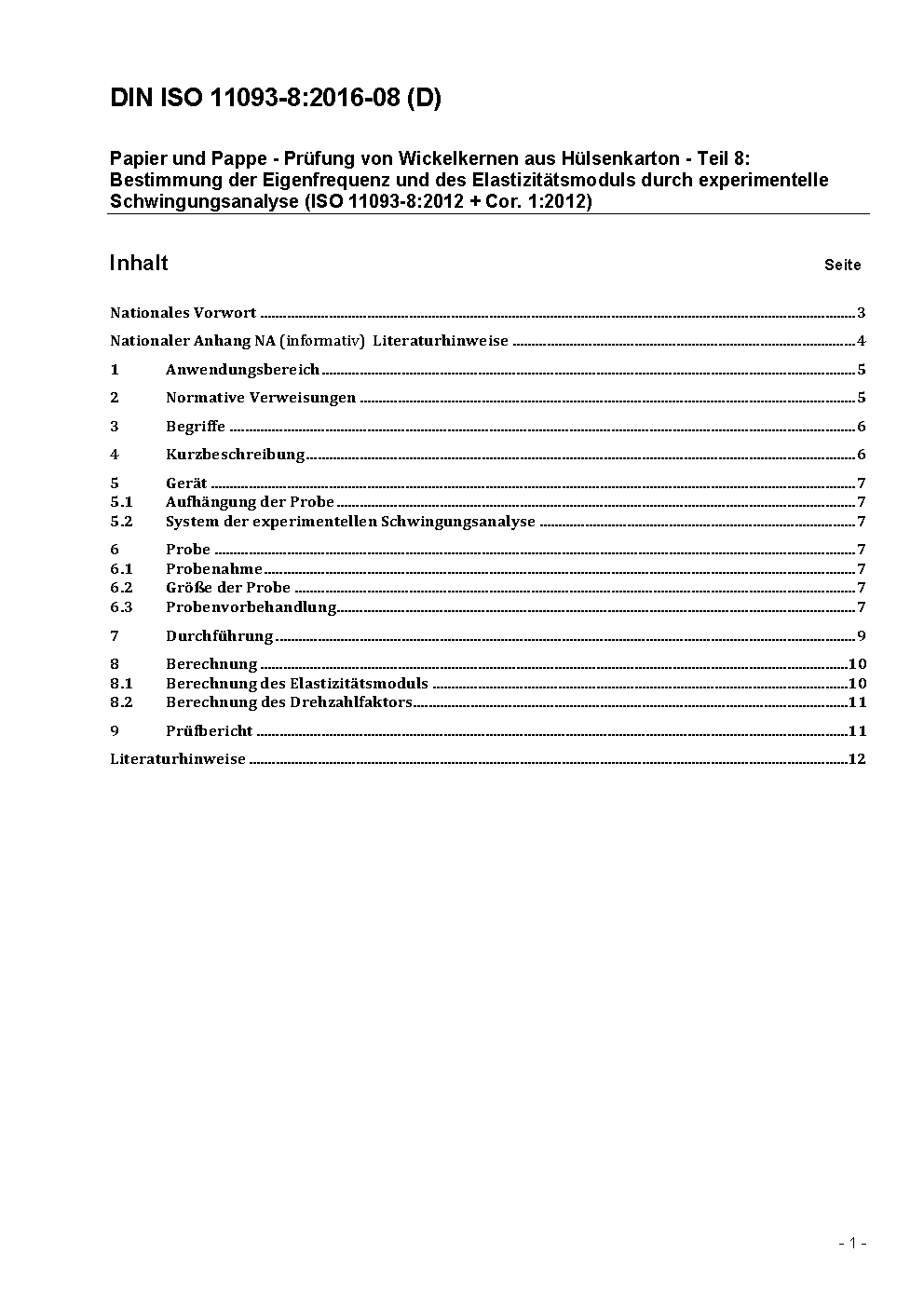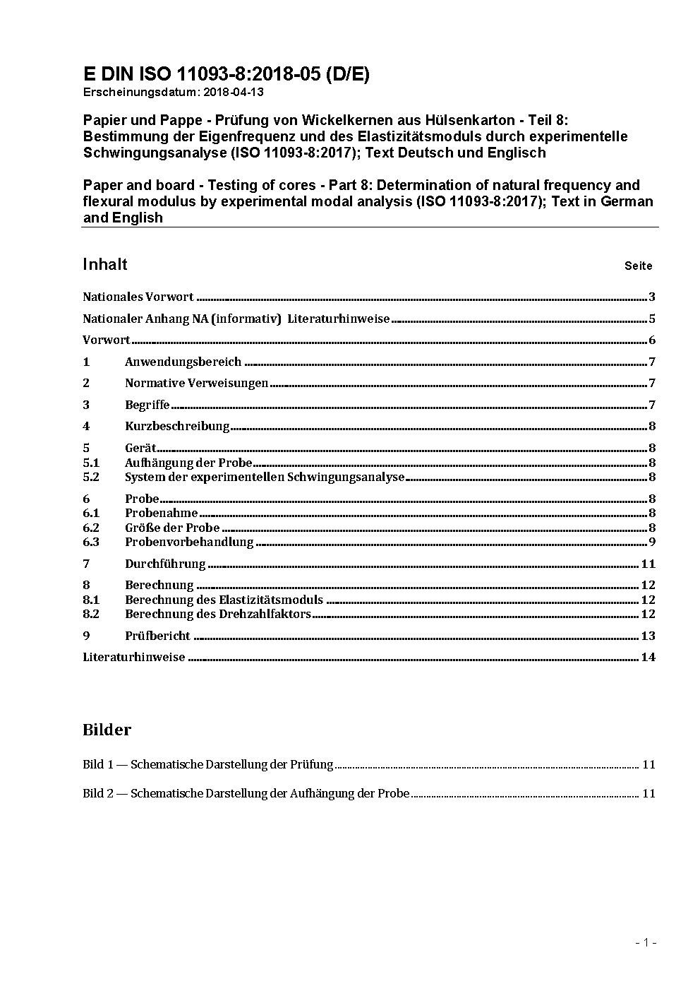 Papier und Pappe - Prüfung von Wickelkernen aus Hülsenkarton - Teil 8: Bestimmung der Eigenfrequenz und des Elastizitätsmoduls durch experimentelle Schwingungsanalyse (ISO 11093-8:2017); Text Deutsch und Englisch