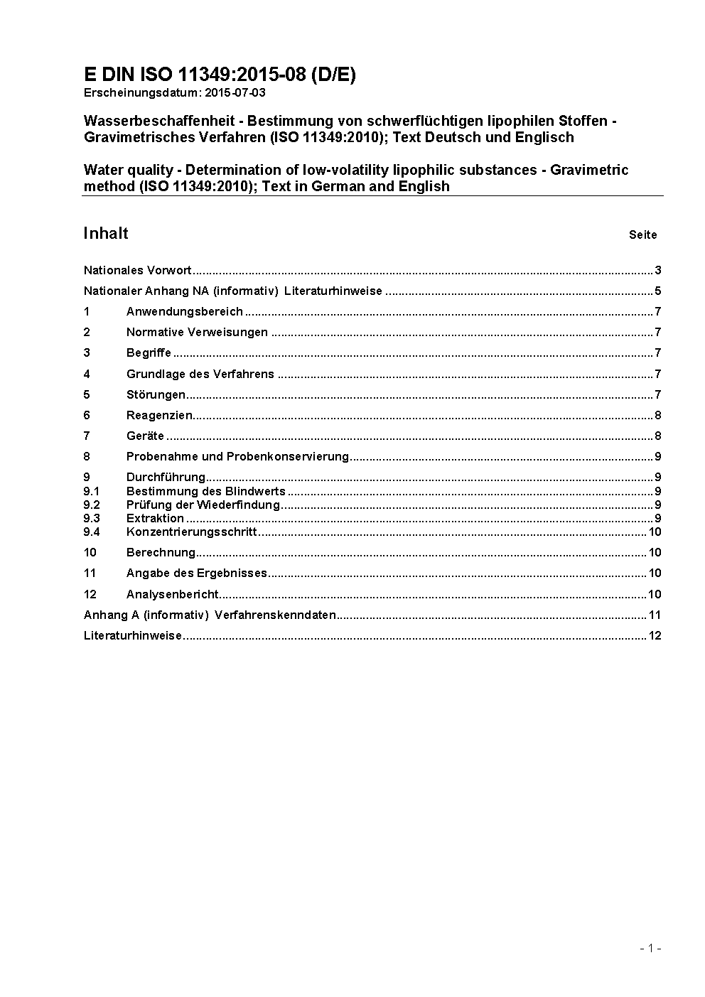 Wasserbeschaffenheit - Bestimmung von schwerflüchtigen lipophilen Stoffen - Gravimetrisches Verfahren (ISO 11349:2010)