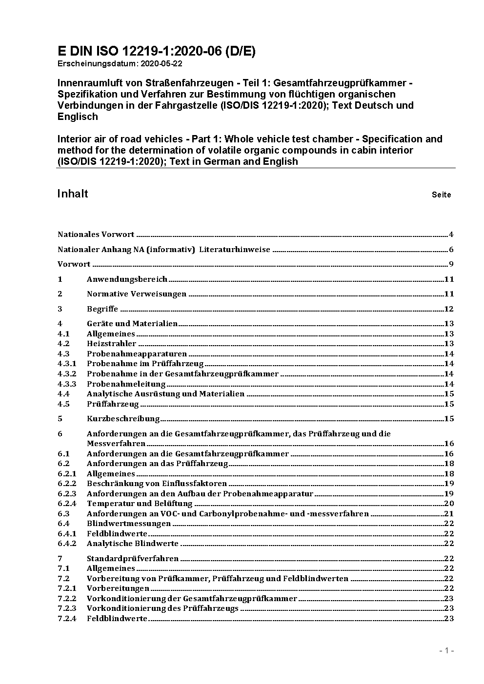 Innenraumluft von Straßenfahrzeugen - Teil 1: Gesamtfahrzeugprüfkammer - Spezifikation und Verfahren zur Bestimmung von flüchtigen organischen Verbindungen in der Fahrgastzelle (ISO/DIS 12219-1:2020); Text Deutsch und Englisch