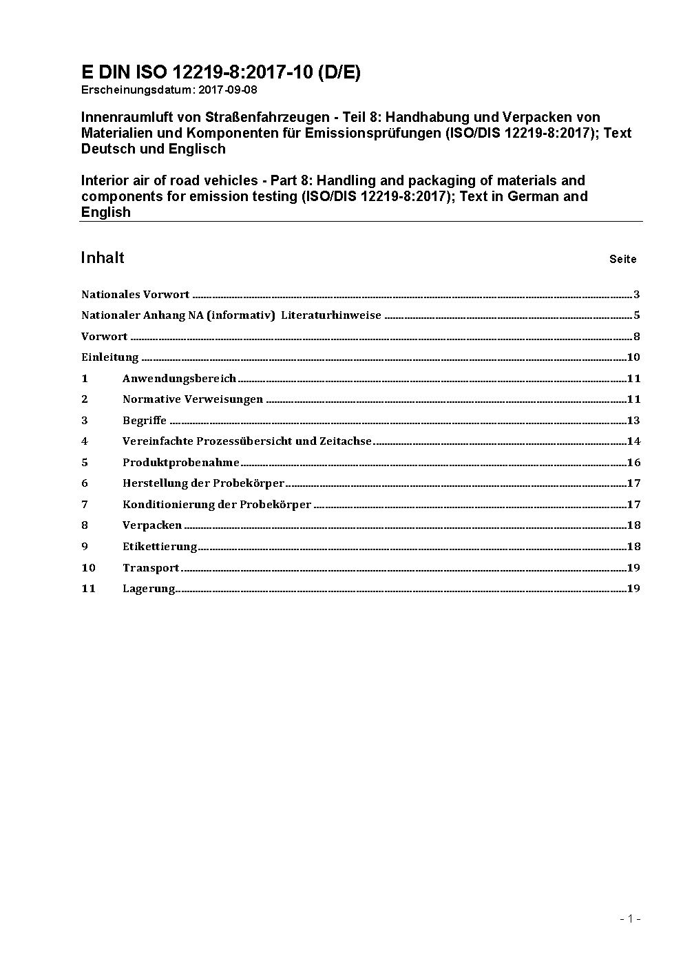 Innenraumluft von Straßenfahrzeugen - Teil 8: Handhabung und Verpacken von Materialien und Komponenten für Emissionsprüfungen (ISO/DIS 12219-8:2017); Text Deutsch und Englisch