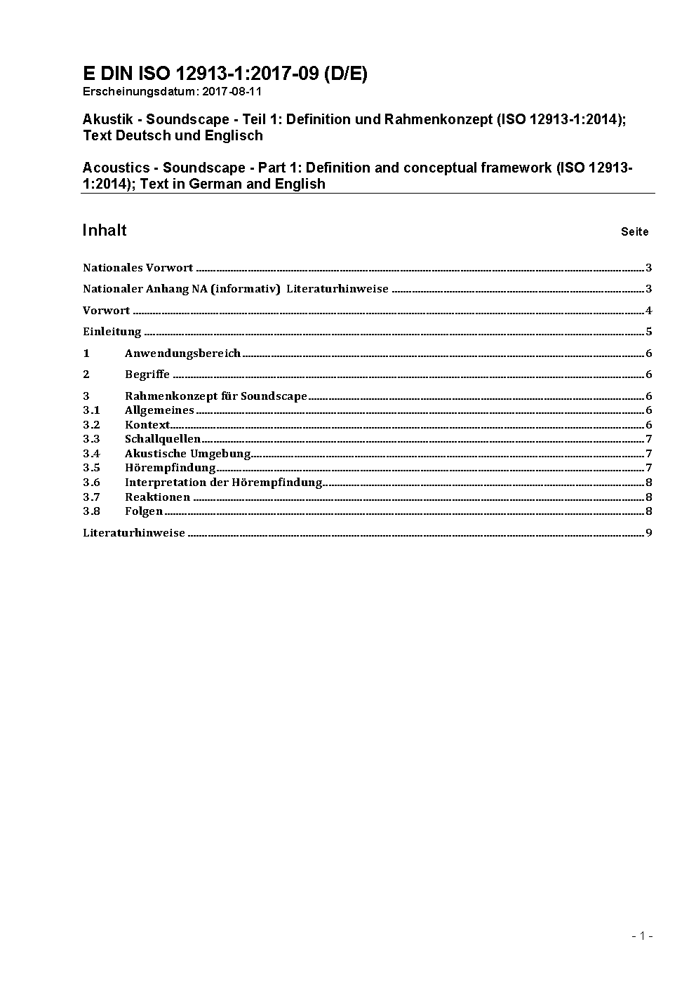 Acoustics - Soundscape - Part 1: Definition and conceptual framework (ISO 12913-1:2014); Text in German and English