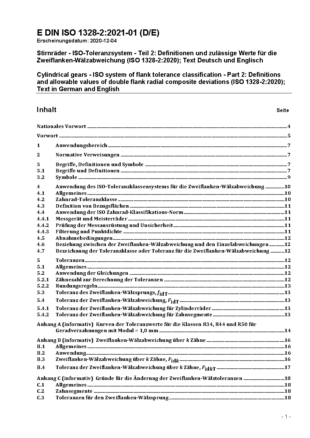 Stirnräder - ISO-Toleranzsystem - Teil 2: Definitionen und zulässige Werte für die Zweiflanken-Wälzabweichung (ISO 1328-2:2020)