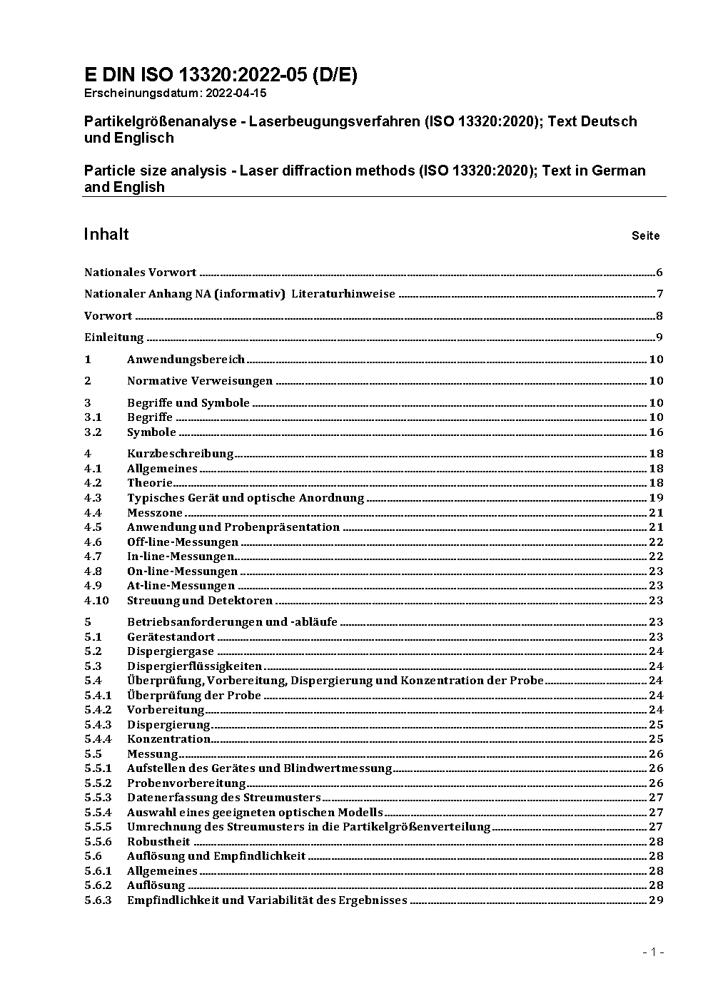 Partikelgrößenanalyse - Laserbeugungsverfahren (ISO 13320:2020); Text Deutsch und Englisch