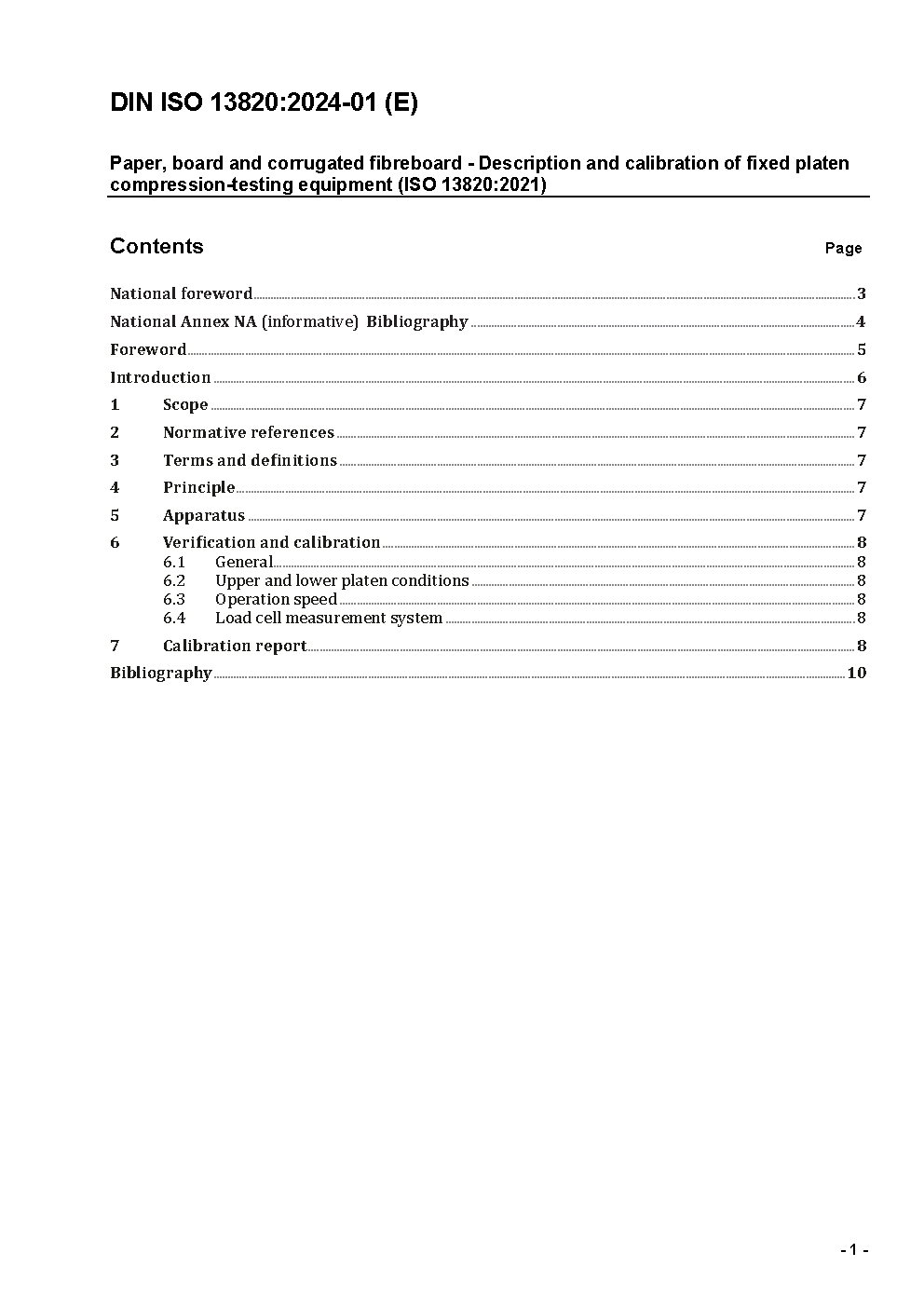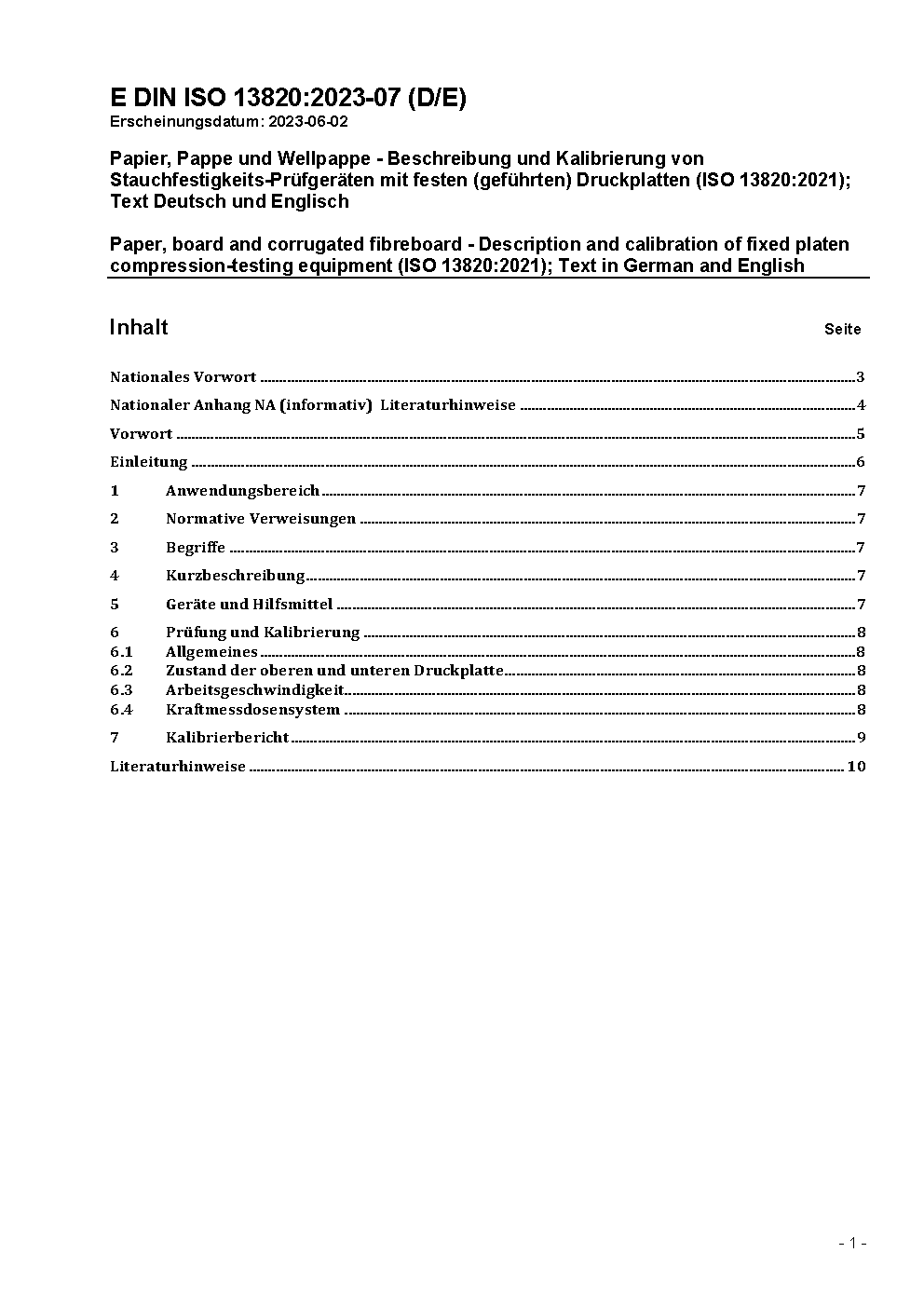 Papier, Pappe und Wellpappe - Beschreibung und Kalibrierung von Stauchfestigkeits-Prüfgeräten mit festen (geführten) Druckplatten (ISO 13820:2021); Text Deutsch und Englisch