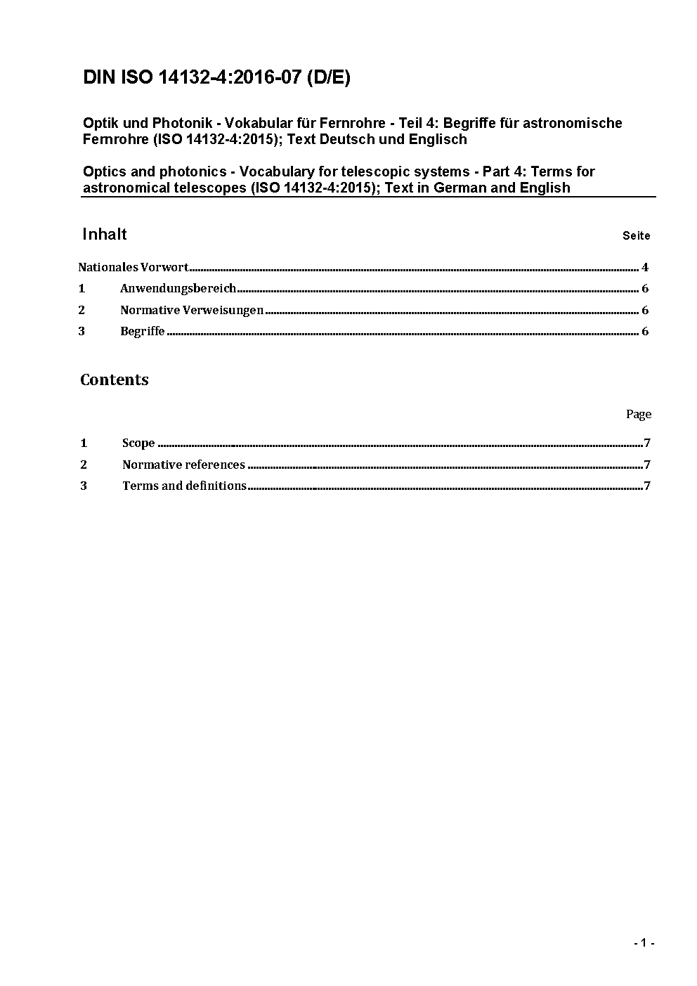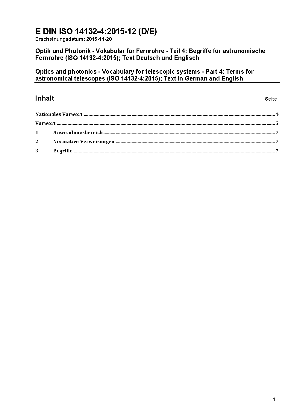 Optik und Photonik - Vokabular für Fernrohre - Teil 4: Begriffe für astronomische Fernrohre (ISO 14132-4:2015); Text Deutsch und Englisch