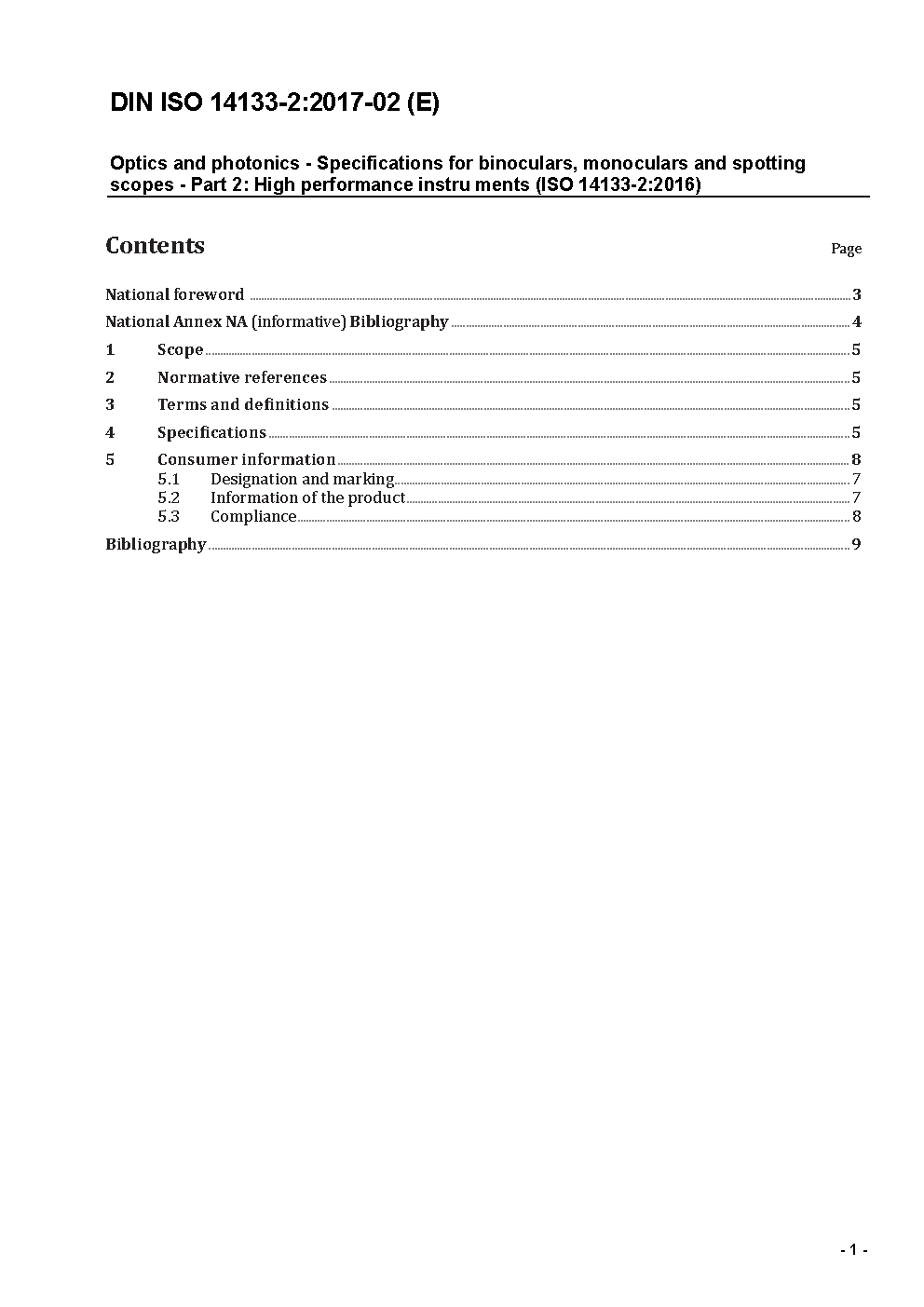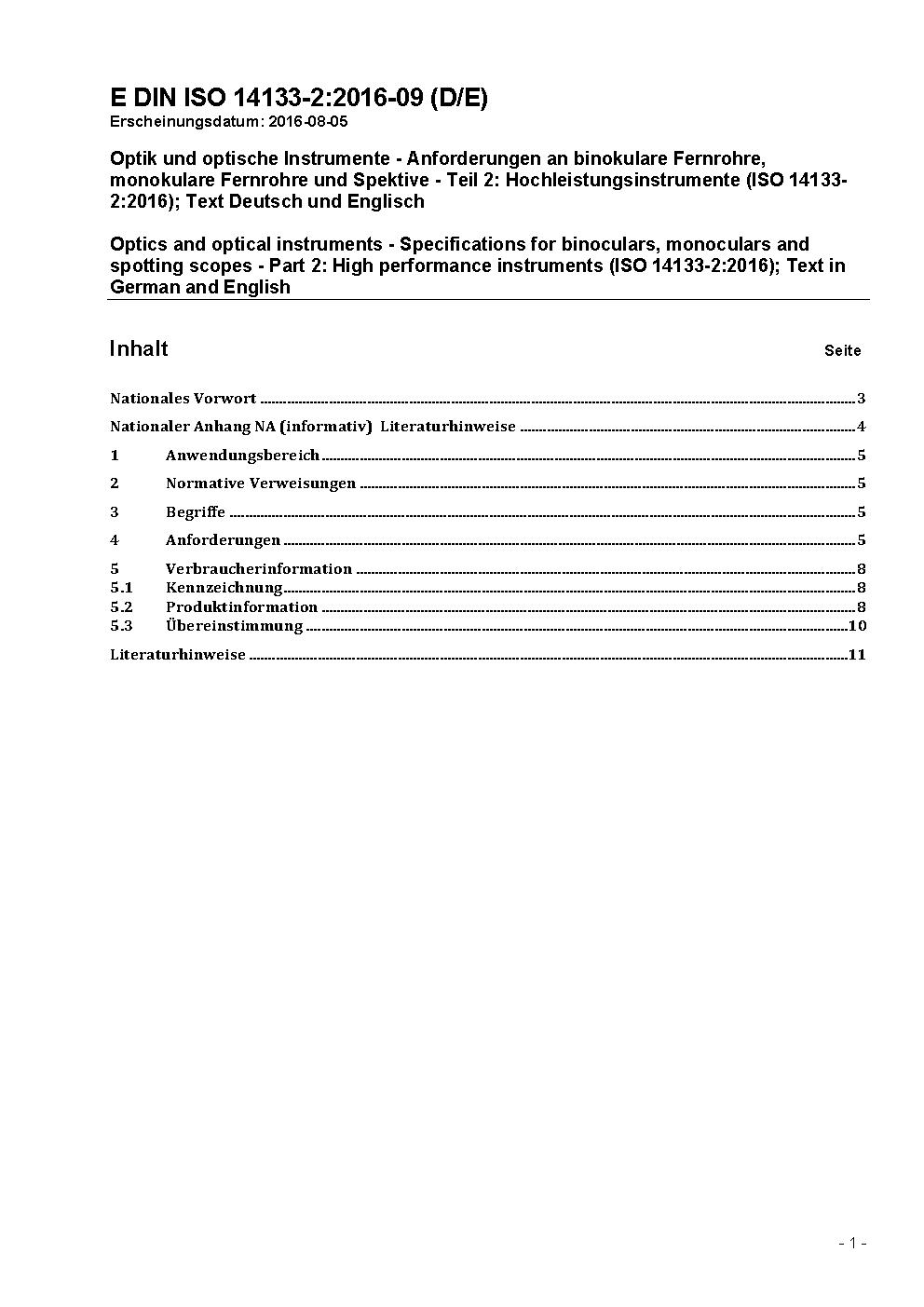 Optik und optische Instrumente - Anforderungen an binokulare Fernrohre, monokulare Fernrohre und Spektive - Teil 2: Hochleistungsinstrumente (ISO 14133-2:2016); Text Deutsch und Englisch