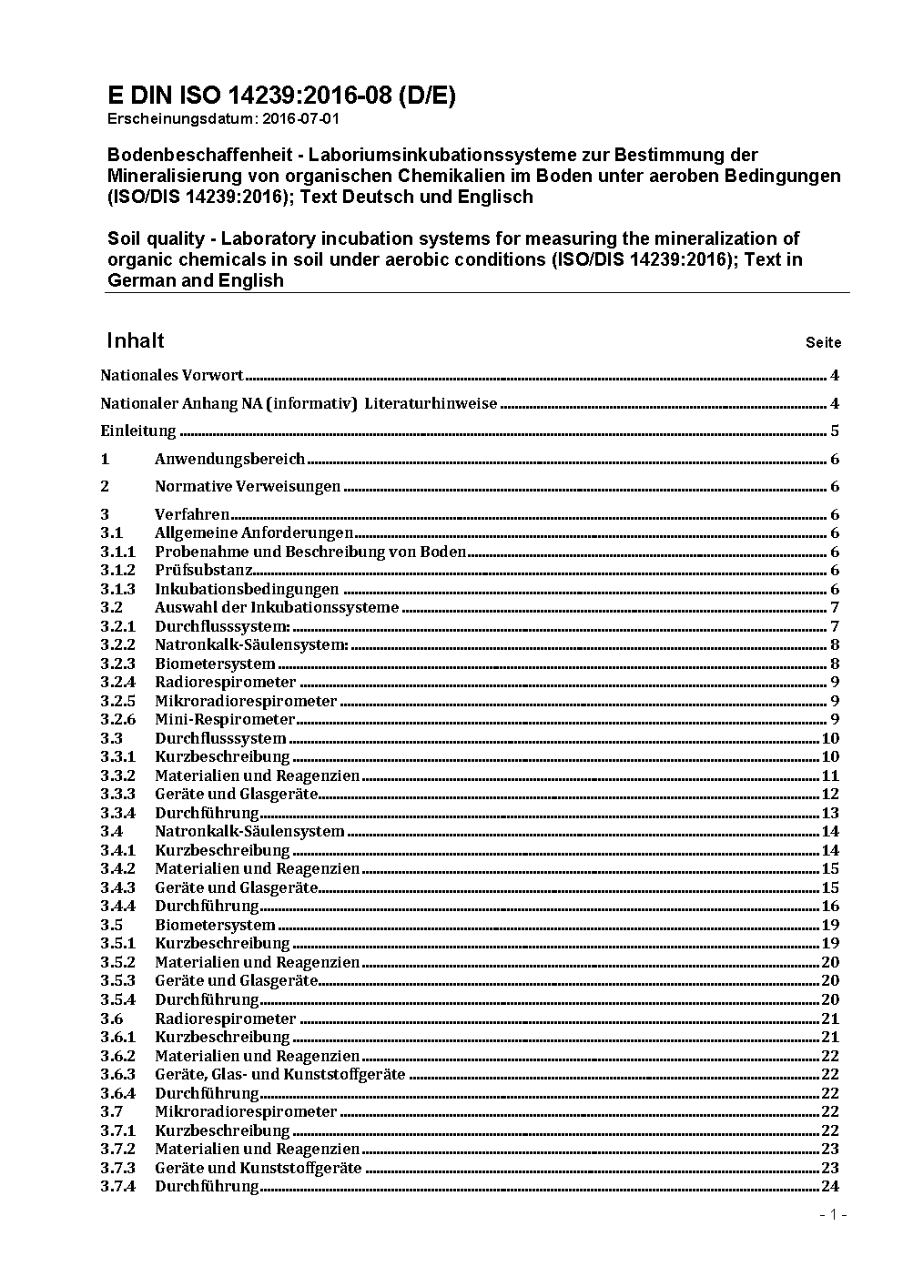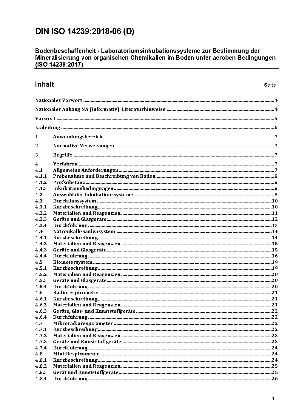 Bodenbeschaffenheit - Laboratoriumsinkubationssysteme zur Bestimmung der Mineralisierung von organischen Chemikalien im Boden unter aeroben Bedingungen (ISO 14239:2017)