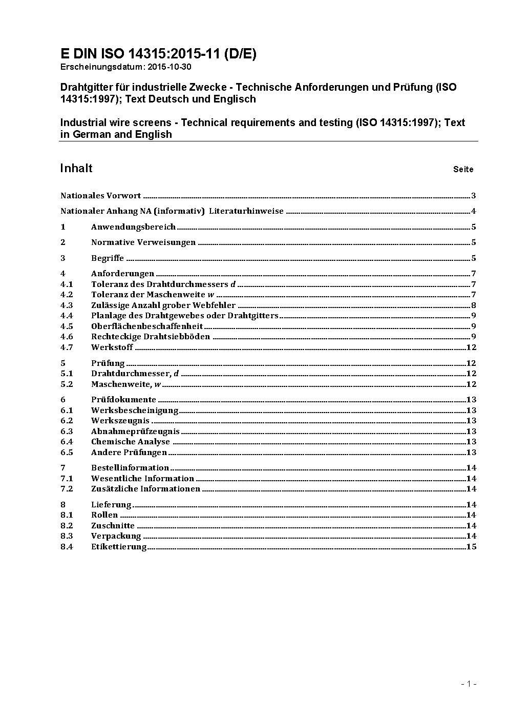 Industrial wire screens - Technical requirements and testing (ISO 14315:1997); Text in German and English