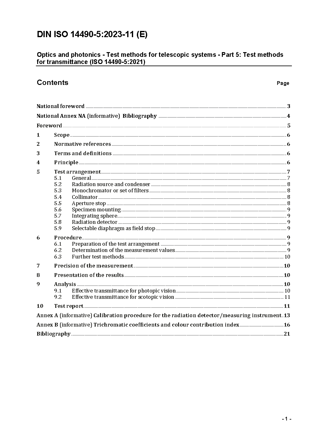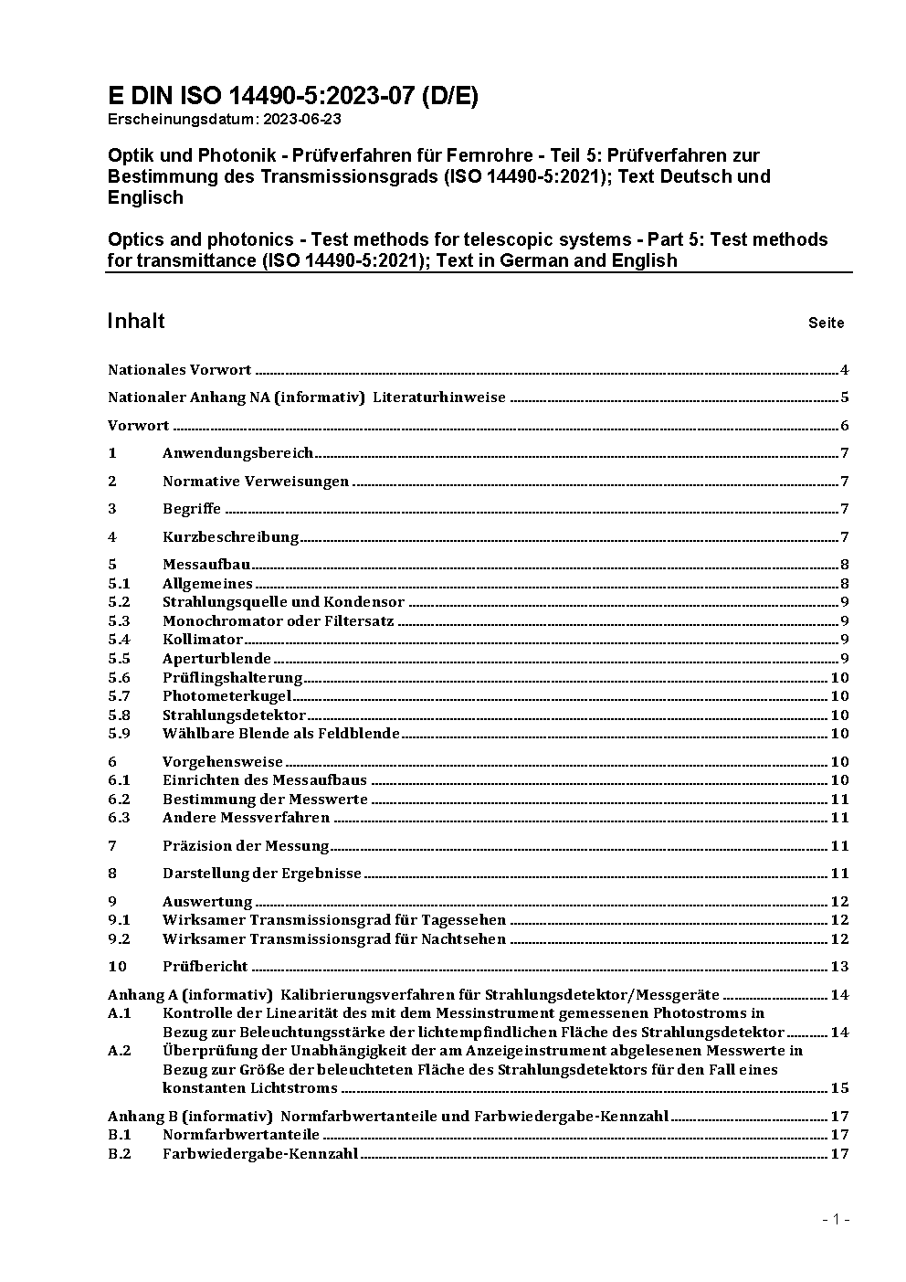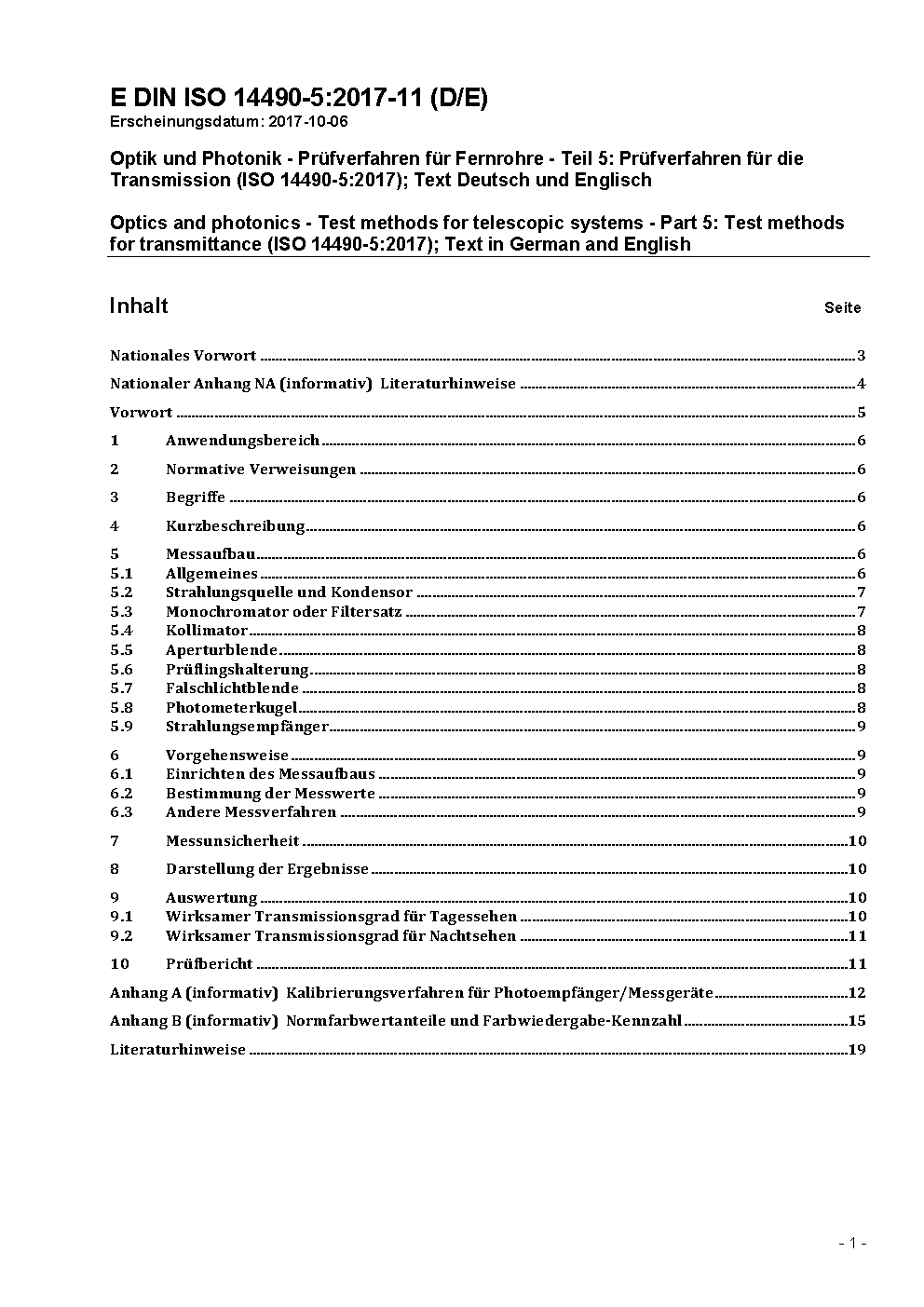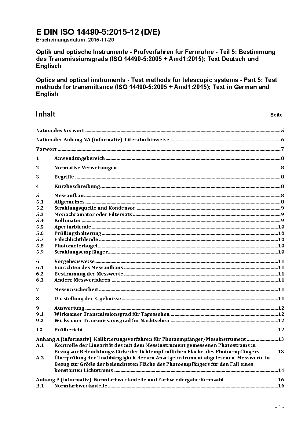 Optik und optische Instrumente - Prüfverfahren für Fernrohre - Teil 5: Bestimmung des Transmissionsgrads (ISO 14490-5:2005 + Amd1:2015); Text Deutsch und Englisch