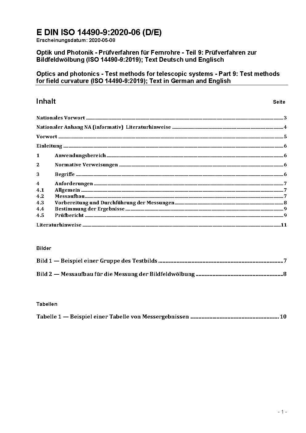 Optik und Photonik - Prüfverfahren für Fernrohre - Teil 9: Prüfverfahren zur Bildfeldwölbung (ISO 14490-9:2019)