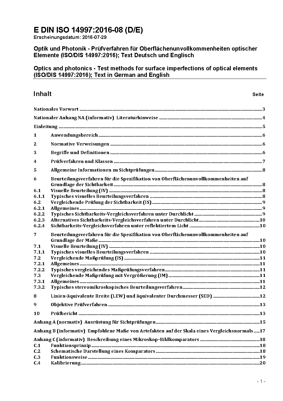Optik und Photonik - Prüfverfahren für Oberflächenunvollkommenheiten optischer Komponenten (ISO 14997:2011)