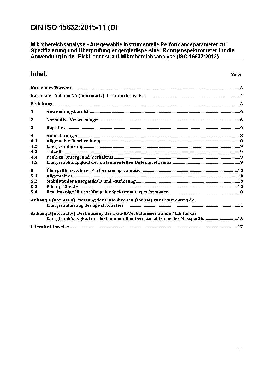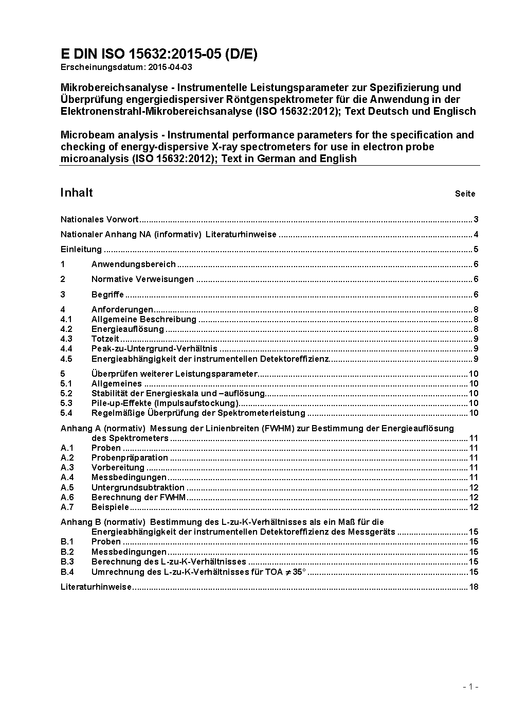 Mikrobereichsanalyse - Ausgewählte instrumentelle Performanceparameter zur Spezifizierung und Überprüfung engergiedispersiver Röntgenspektrometer (EDS) für die Anwendung mit einem Rasterelektronenmikroskop (REM) oder einem Elektronenstrahlmikroanalysator (ESMA) (ISO 15632:2021)