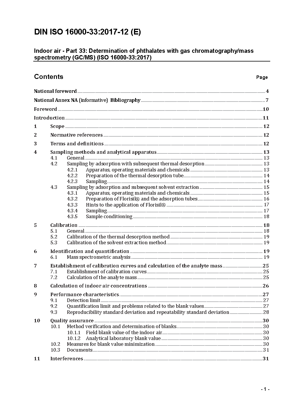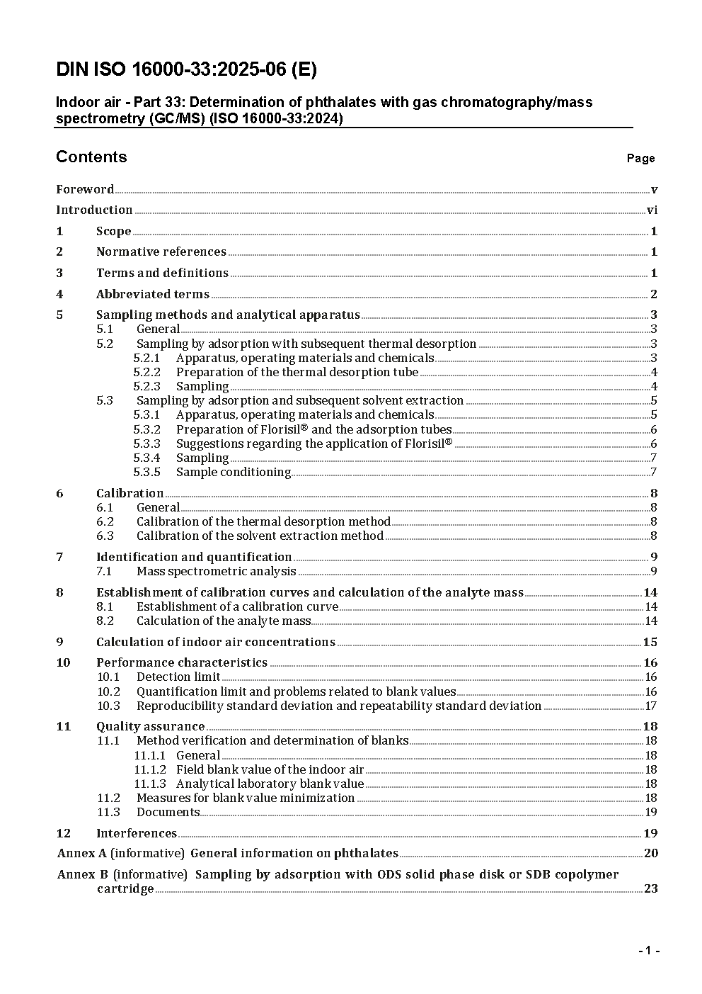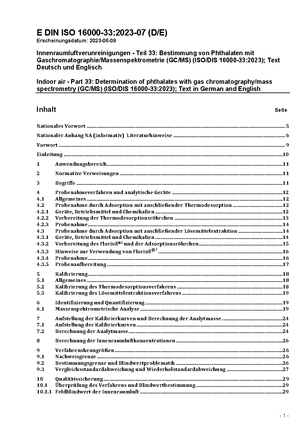 Innenraumluftverunreinigungen - Teil 33: Bestimmung von Phthalaten mit Gaschromatographie/Massenspektrometrie (GC/MS) (ISO/DIS 16000-33:2023); Text Deutsch und Englisch