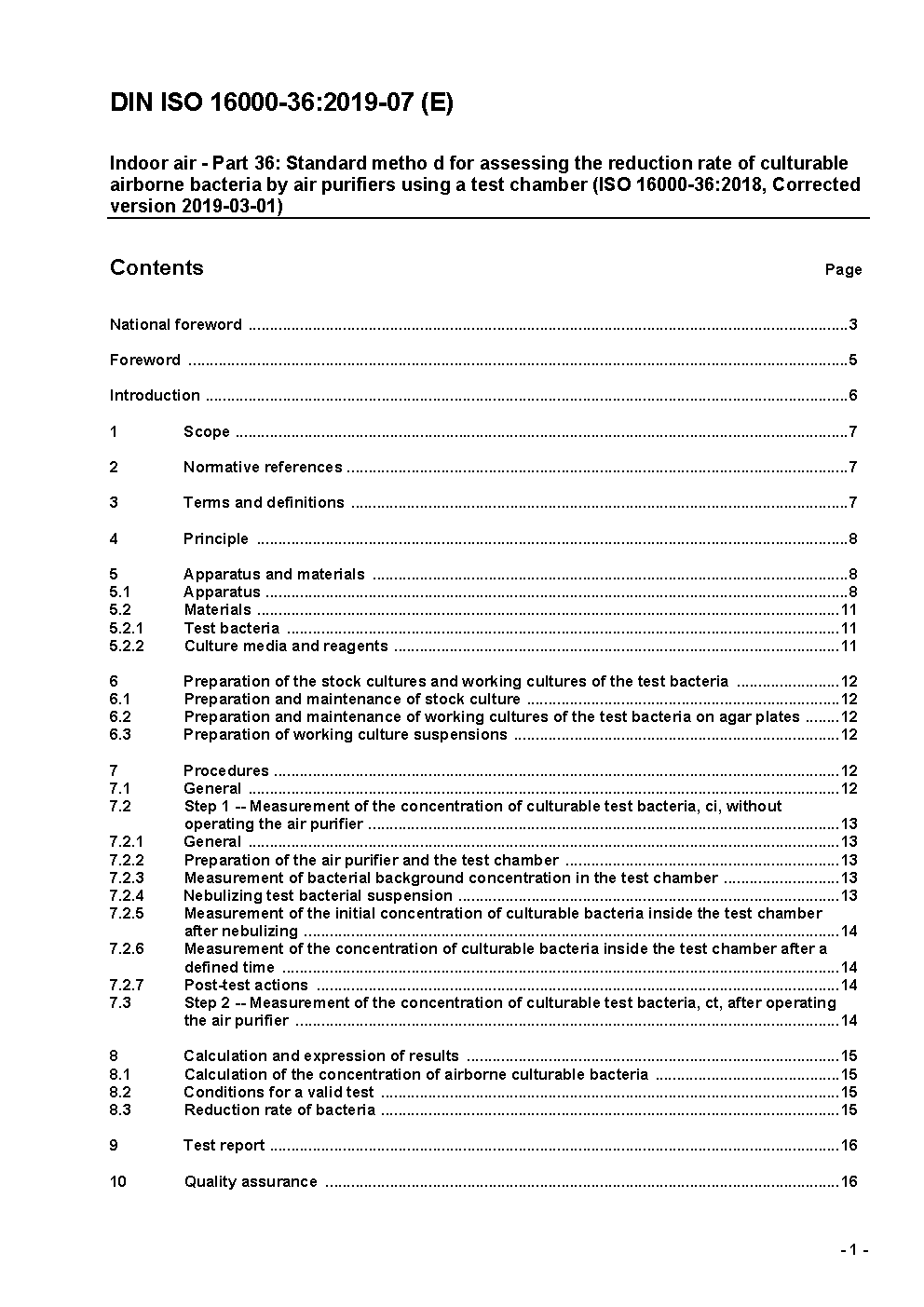 Indoor air - Part 36: Standard method for assessing the reduction rate of culturable airborne bacteria by air purifiers using a test chamber (ISO/DIS 16000-36:2017); Text in German and English
